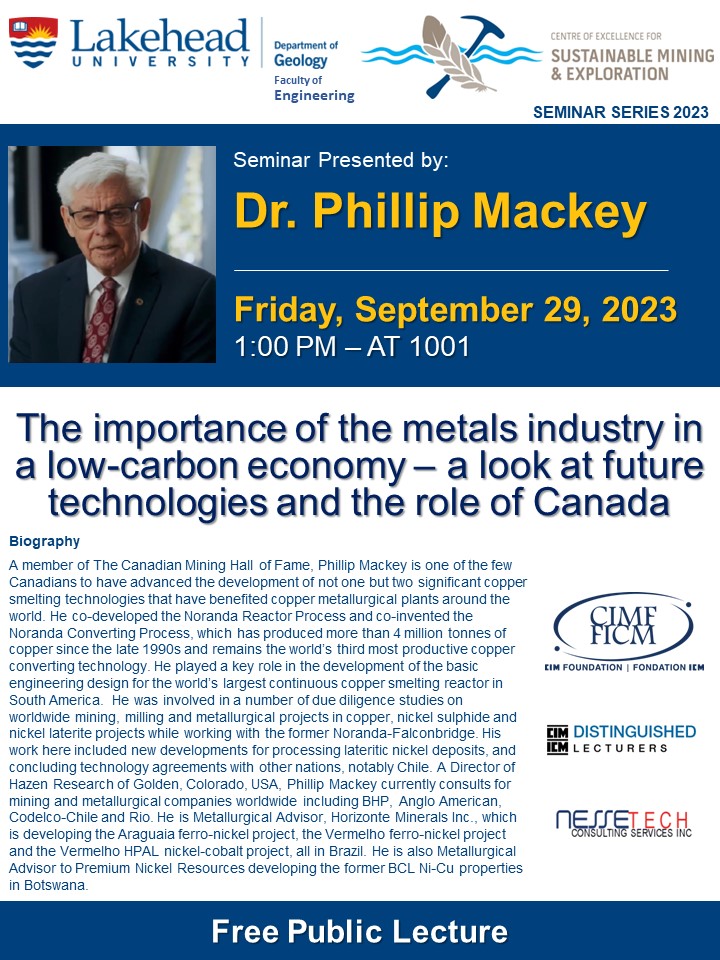 This free public lecture will be presented by Dr. Phillip Mackey, a well-known metallurgist in the field of non-ferrous extractive metallurgy and a member of the Canadian Mining Hall of Fame.