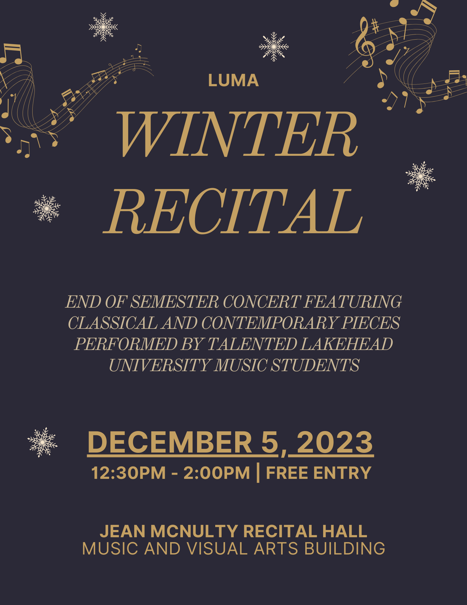 Get ready to be dazzled at our highly anticipated LUMA Winter Recital! On December 5th, 2023, starting at 12:30 p.m. at the Jean McNulty Recital Hall (MV1004), we invite you to join us for an unforgettable evening of musical sensation featuring a diverse repertoire of classical and contemporary pieces performed by our talented students.
