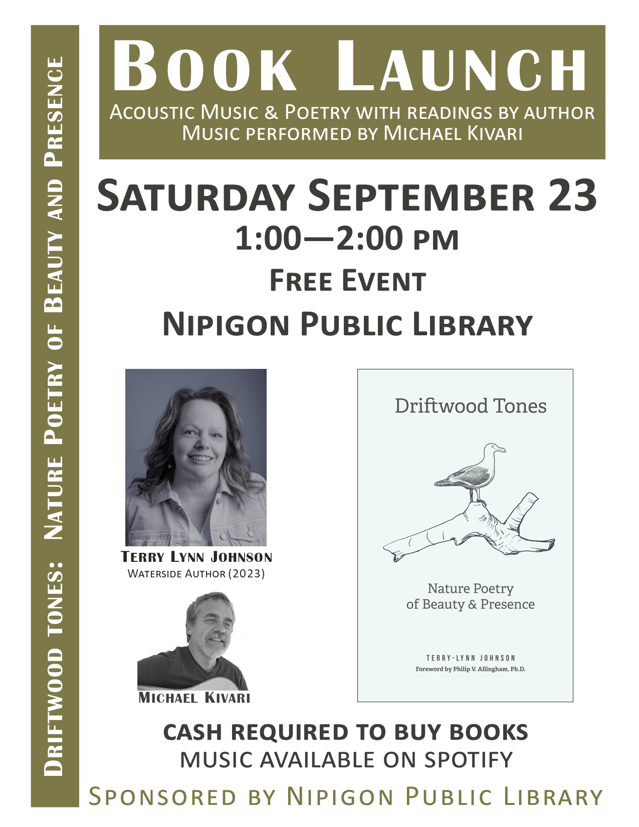 Sponsored by Nipigon Library. Acoustic music and poetry with reading by author, Terry-Lynn Johnson, and music performed by Michael Kivari.