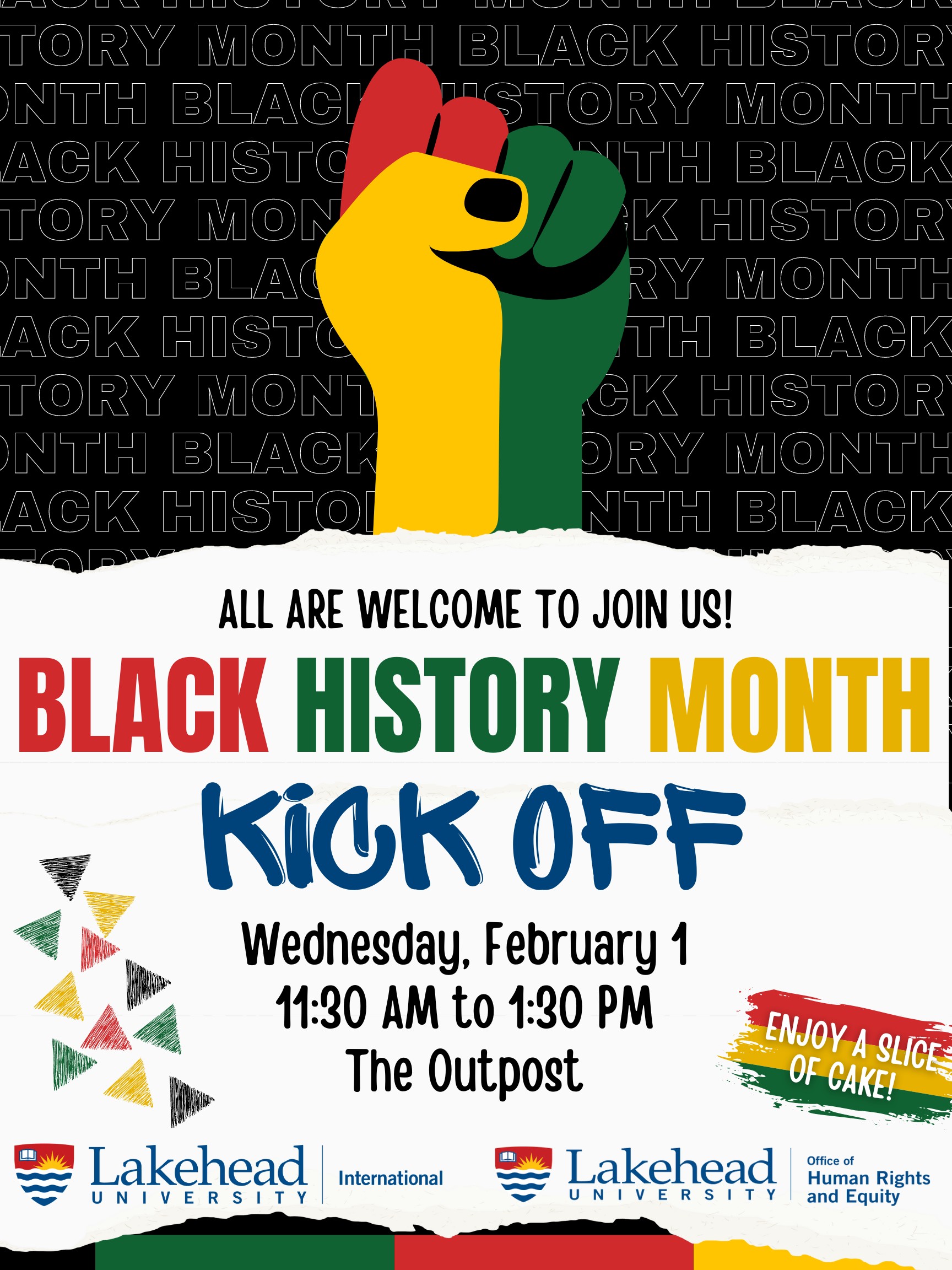 All students, staff, and faculty are invited to join us on Wednesday, February 1 as the Office of Human Rights and Equity and Lakehead International join AFCASA in The Outpost to kick of Black History Month.