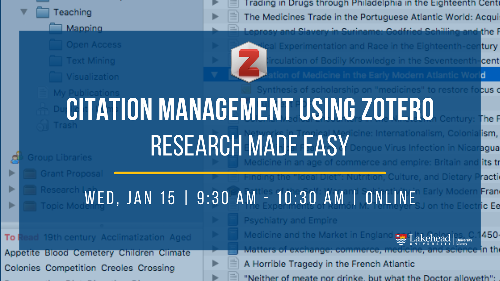 Zotero is a free and convenient tool that can be used to help you manage information for your research, insert citations into your writing and easily create bibliographies. This session will provide an overview of how Zotero can support your work throughout the research process, with hands-on opportunities to practice using the tool.