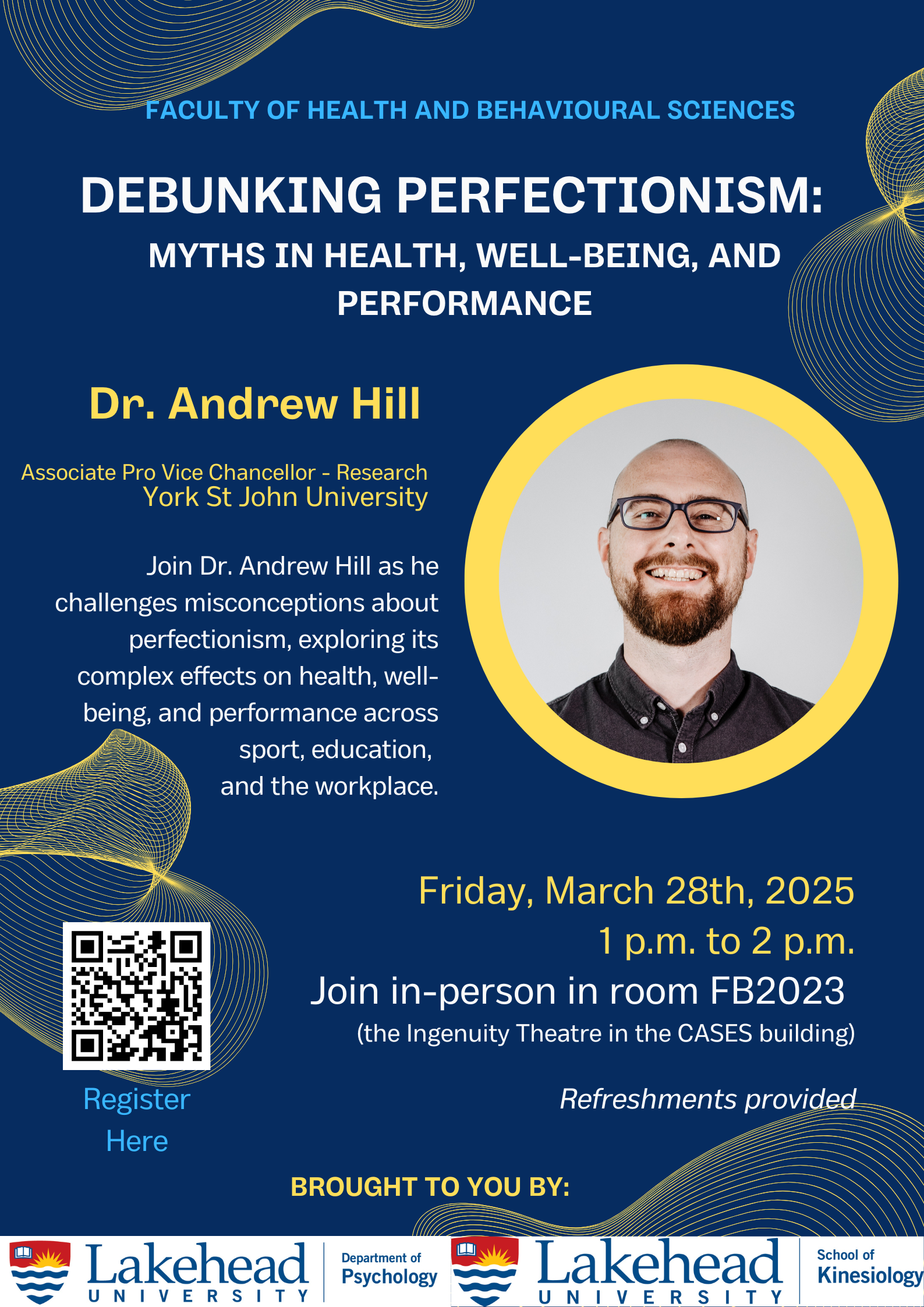 Join Dr. Andrew Hill as he challenges misconceptions about perfectionism, exploring its complex effects on health, well-being, and performance across sport, education, and the workplace. Dr. Hill is a professor of sport and exercise psychology and the Associate Pro Vice Chancellor: Research at York St John University. He is recognized as an eminent researcher in the UK and internationally. To register, scan the QR code in the poster.