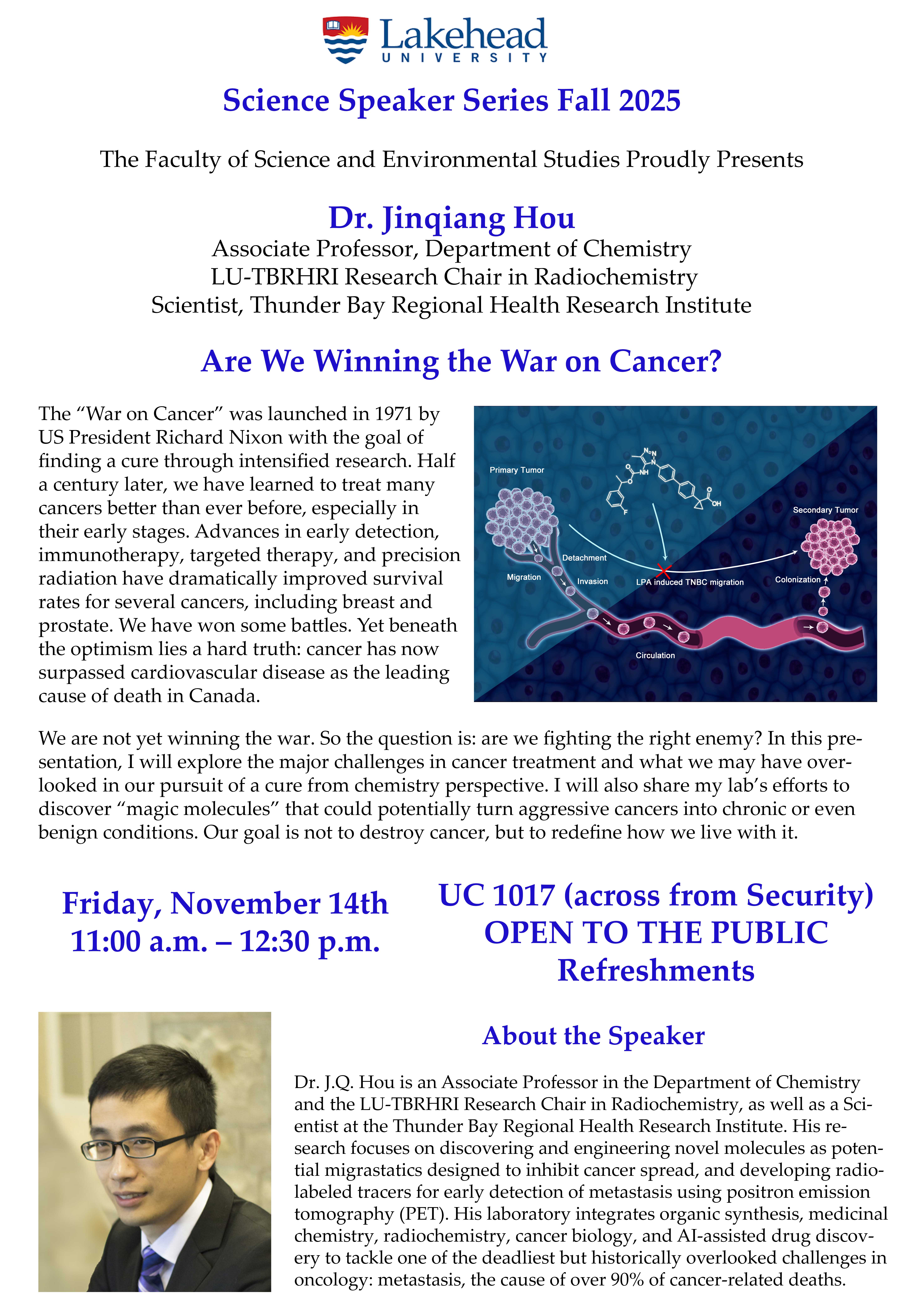 Dr. J.Q. Hou is an Associate Professor in the Department of Chemistry at Lakehead University and the LU-TBRHRI Research Chair in Radiochemistry, as well as a Scientist at the Thunder Bay Regional Health Research Institute. His research focuses on discovering and engineering novel molecules as potential migrastatics designed to inhibit cancer spread, and developing radiolabeled tracers for early detection of metastasis using positron emission tomography (PET). His laboratory integrates organic synthesis, medicinal chemistry, radiochemistry, cancer biology, and AI-assisted drug discovery to tackle one of the deadliest but historically overlooked challenges in oncology: metastasis, the cause of over 90% of cancer-related deaths.