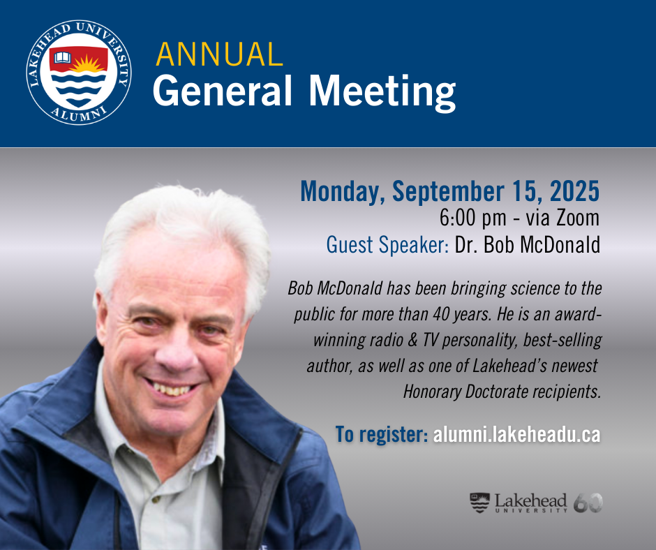This year, we’re especially thrilled to welcome Bob McDonald as our guest speaker. You may know him as the award-winning radio and TV personality behind Quirks & Quarks, or as the author who brings science to life in ways that are fun and accessible. Bob was also recently awarded an Honorary Doctorate from Lakehead University, making this conversation even more special for our alumni community.