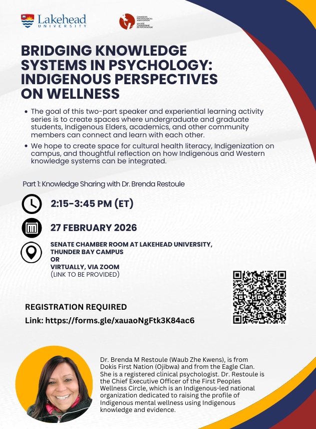 At this time, we invite undergraduate and graduate students from all departments to join us for a 1.5-hour virtual talk, led by Dr. Brenda Restoule, on February 27, 2026, at 2:15 PM. Students may attend the meeting in person in the Senate Chamber room at Lakehead University, Thunder Bay Campus, or virtually, via Zoom (link to be provided).