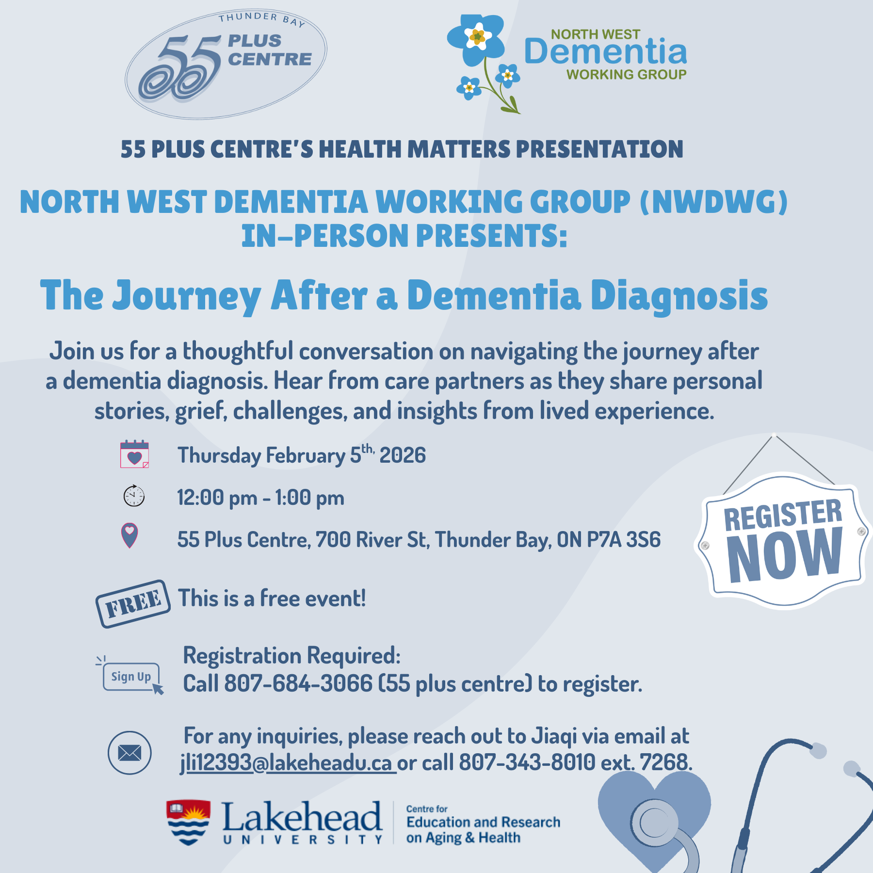 Join the North West Dementia Working Group (NWDWG) for an in-person Health Matters presentation at the 55 Plus Centre titled “The Journey After a Dementia Diagnosis.” This session offers a thoughtful and compassionate conversation about what life can look like following a dementia diagnosis.