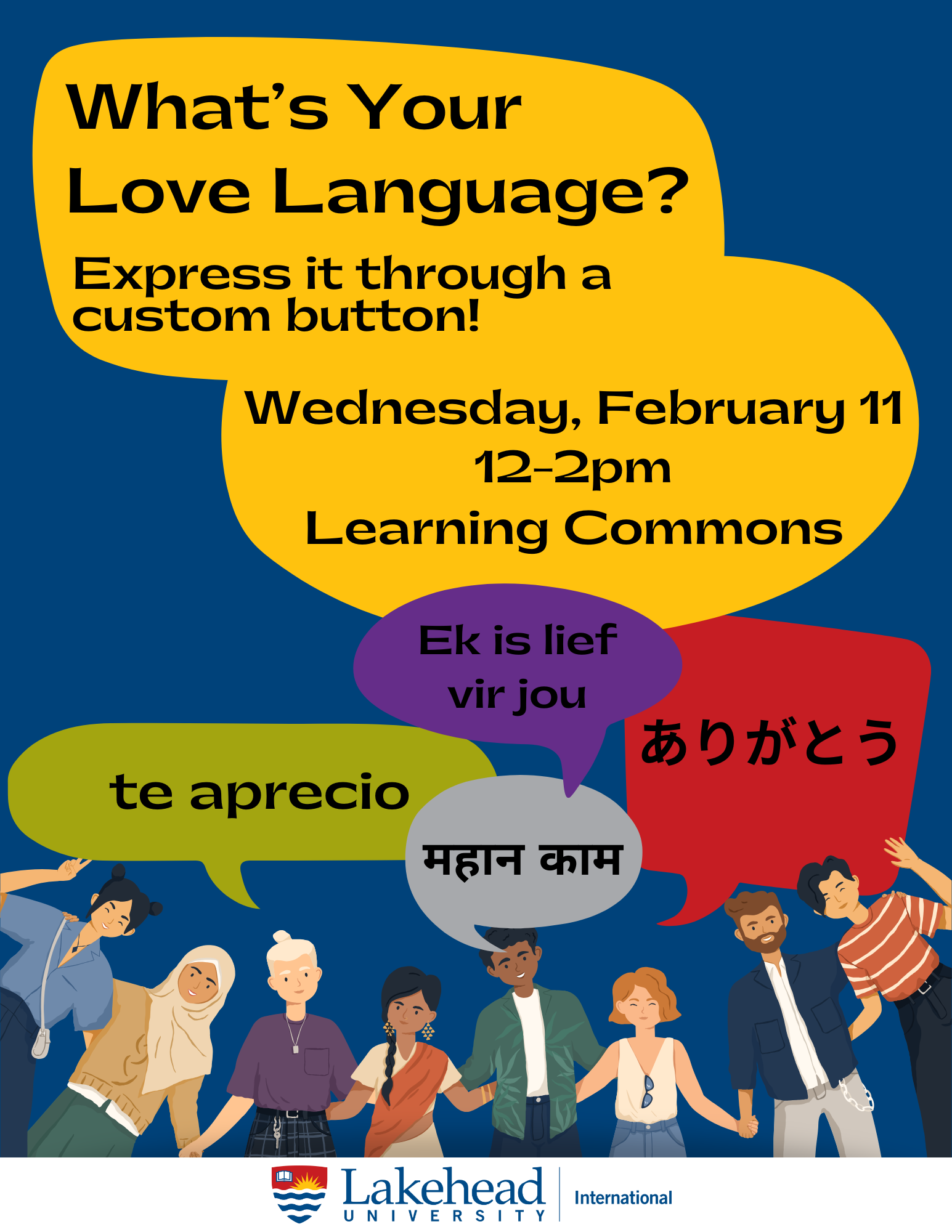 What's your love language? Whether it's words of affirmation, choosing words from different parts of the world, symbols - express it through a custom made button! Show self-love by wearing it proudly or gift it to someone important to you. Visit our table in the Orsi Family Learning Commons on February 11 between 12 and 2 p.m. All are welcome.