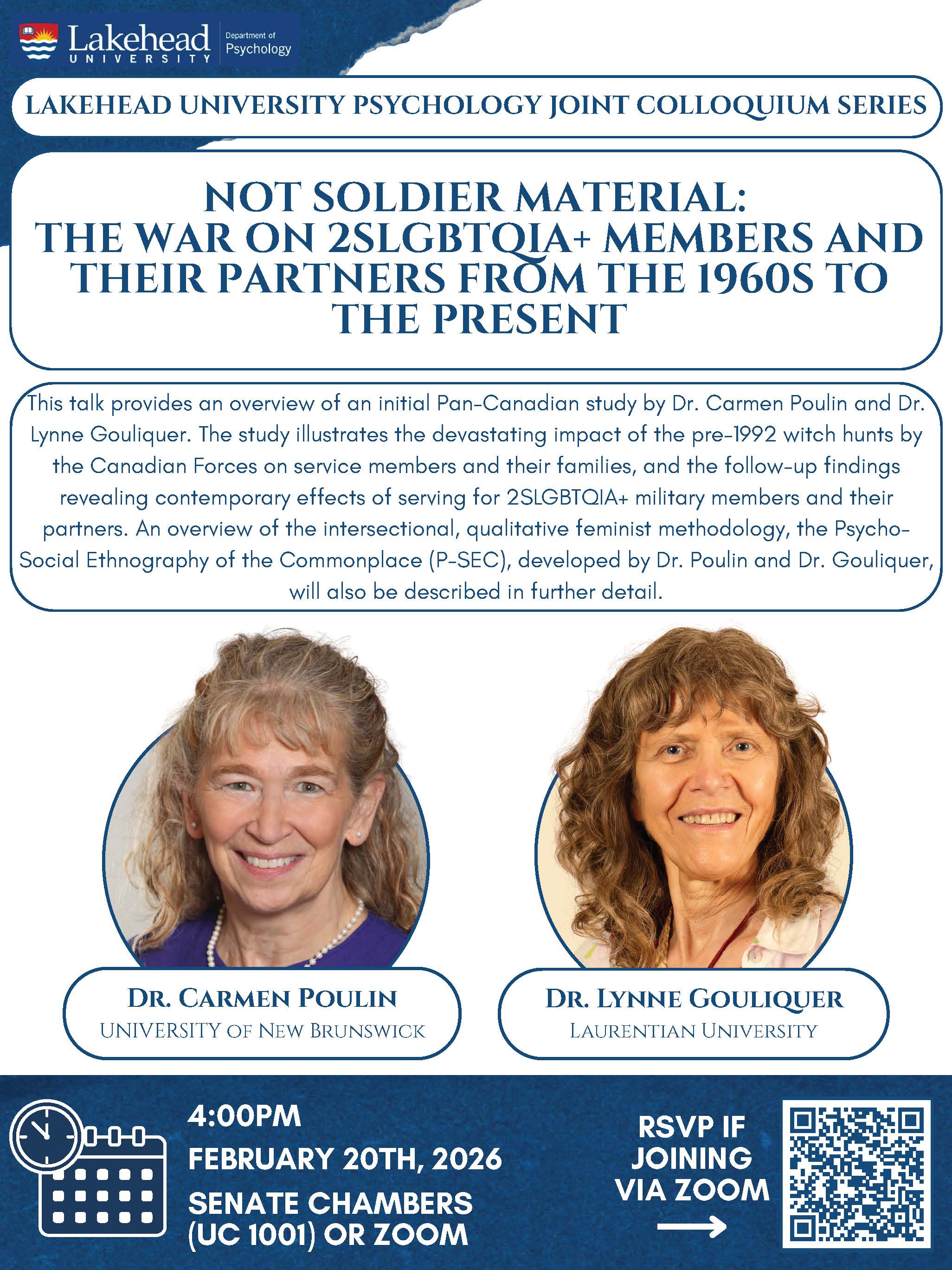 The Department of Psychology is pleased to host a hybrid talk titled "Not Soldier Material: The War on 2SLGBTQIA+ Members and Their Partners from the 1950's to the Present" by visiting speakers, Dr. Carmen Poulin (University of New Brunswick) and Dr. Lynne Gouliquer (Laurentian University) on February 20, starting at 4 p.m., in the Thunder Bay Senate Chambers UC 1001.