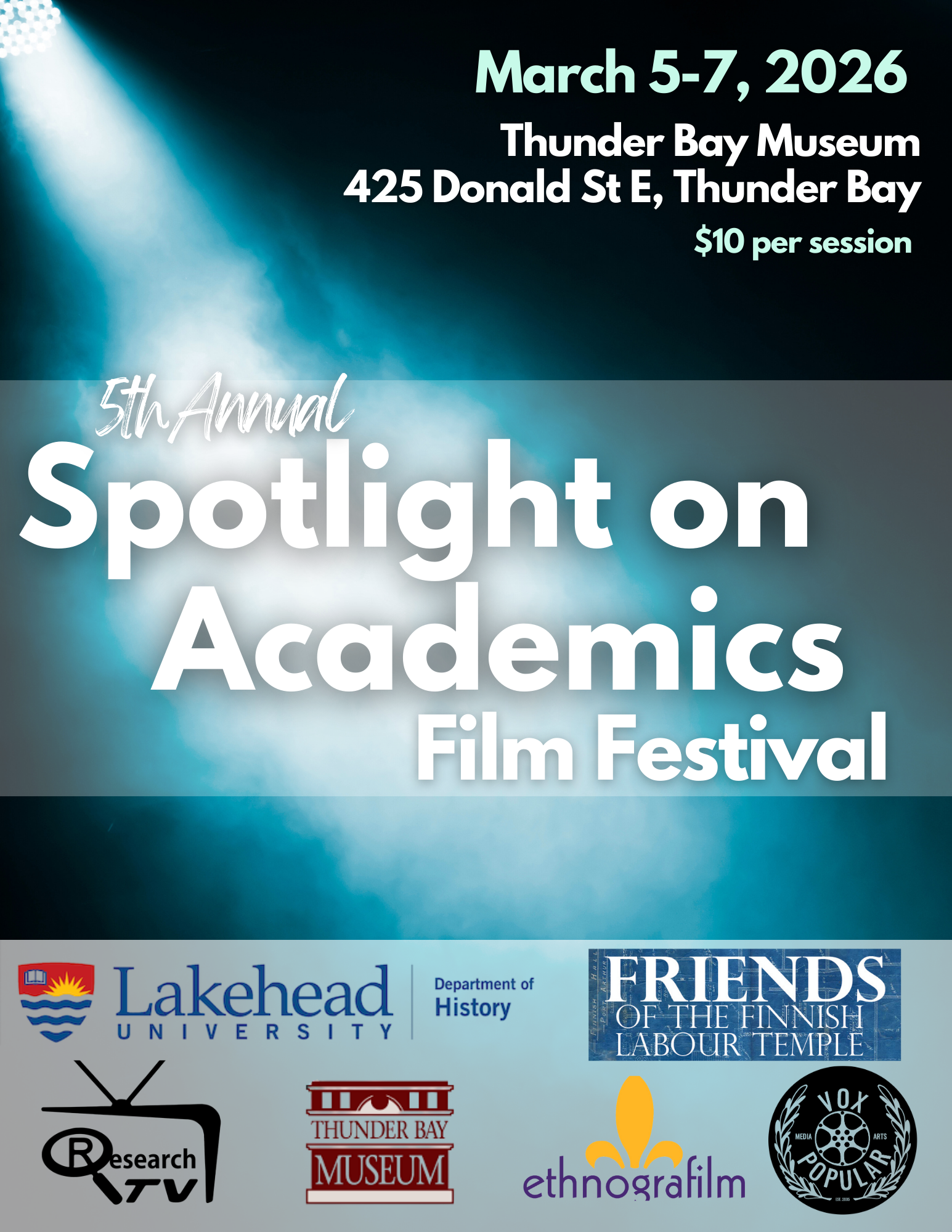 The Department of History is pleased to support the 5th Annual Spotlight on Academics Film Festival. Along with films from around the world, the 2026 festival will be featuring films by or about members of the Lakehead University community. The in-person version of the festival runs on Thursday and Friday evening from 6:00 pm to 10:00 pm and on Saturday afternoon fro 1:00 pm to 5 pm. A larger online version of the festival runs for free on Researchtv.ca from March 8 until March 15.