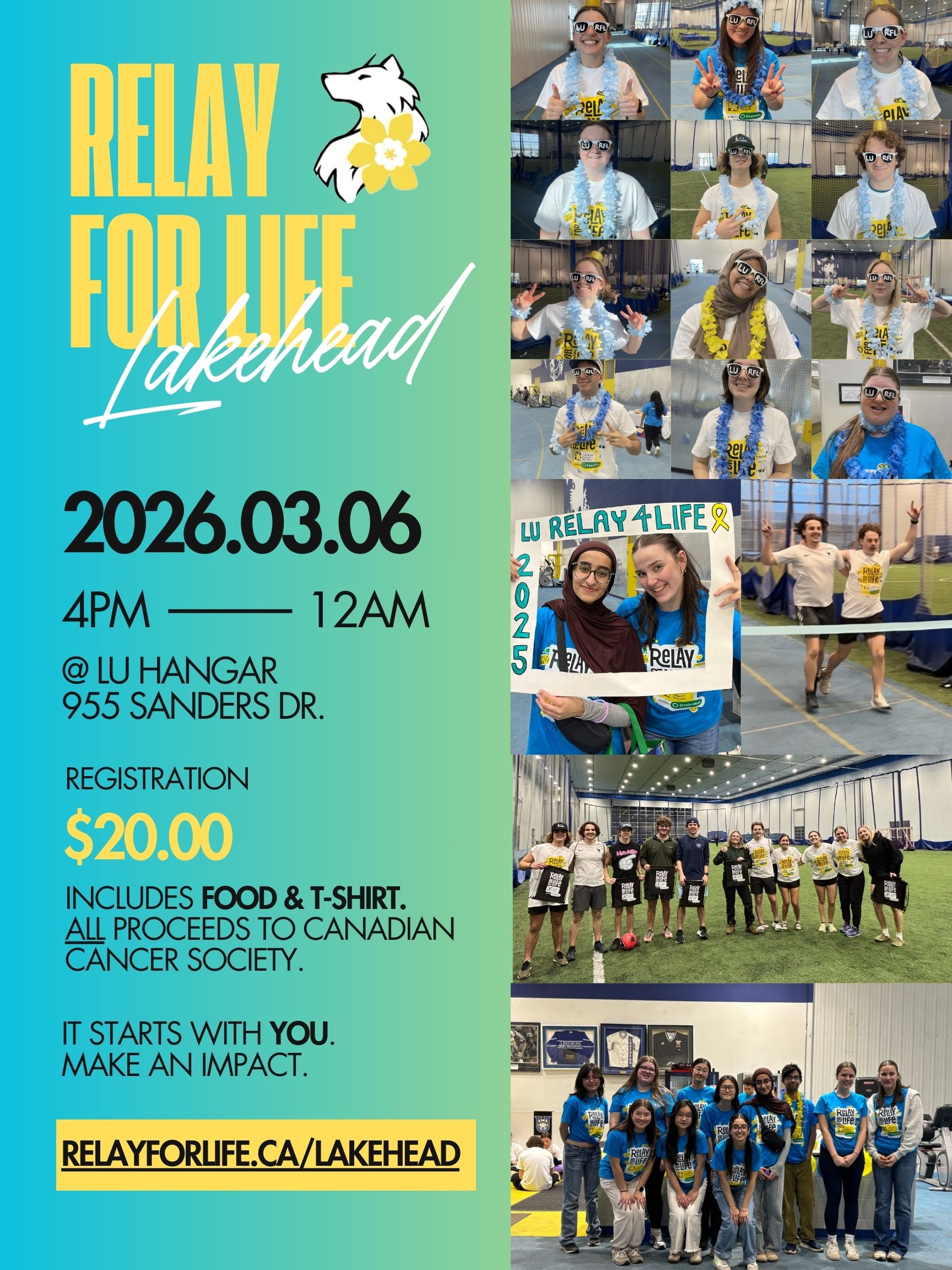 2026 Relay for Life is back at Lakehead! Relay For Life is an official annual walk-a-thon fundraiser in support of Canadian Cancer Society, where all funds raised from the event are donated to support the various cancer treatment, research, and campaign programs ran by Canadian Cancer Society. In addition to being a fundraiser, Relay is an event where the community can come together to reflect and support those impacted by cancer, and demonstrate our perseverance, solidarity and hope to show that life is bigger than cancer.