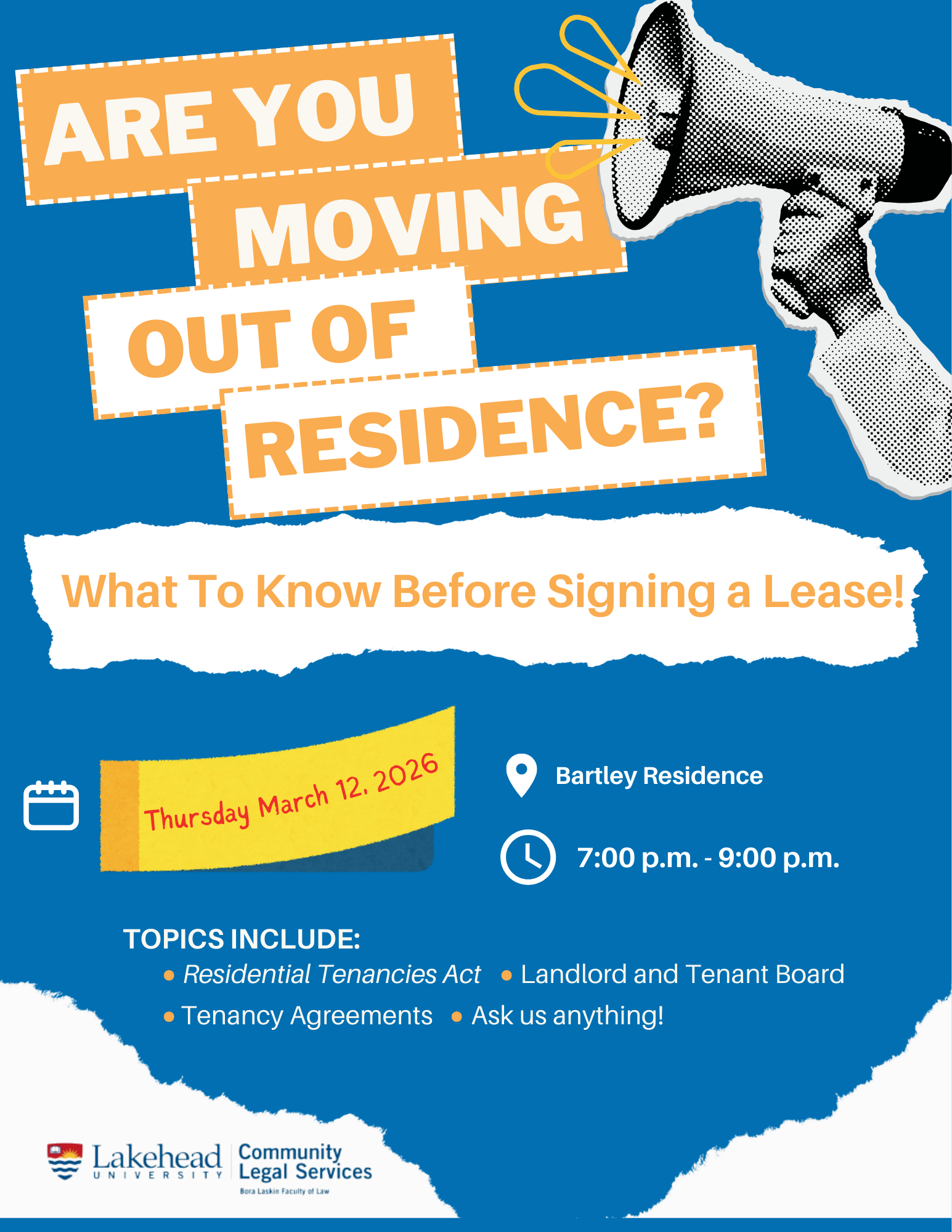 Legal representatives from Lakehead University Community Legal Services will be available to answer students' questions about tenancy rights and what to know before signing a residential lease.