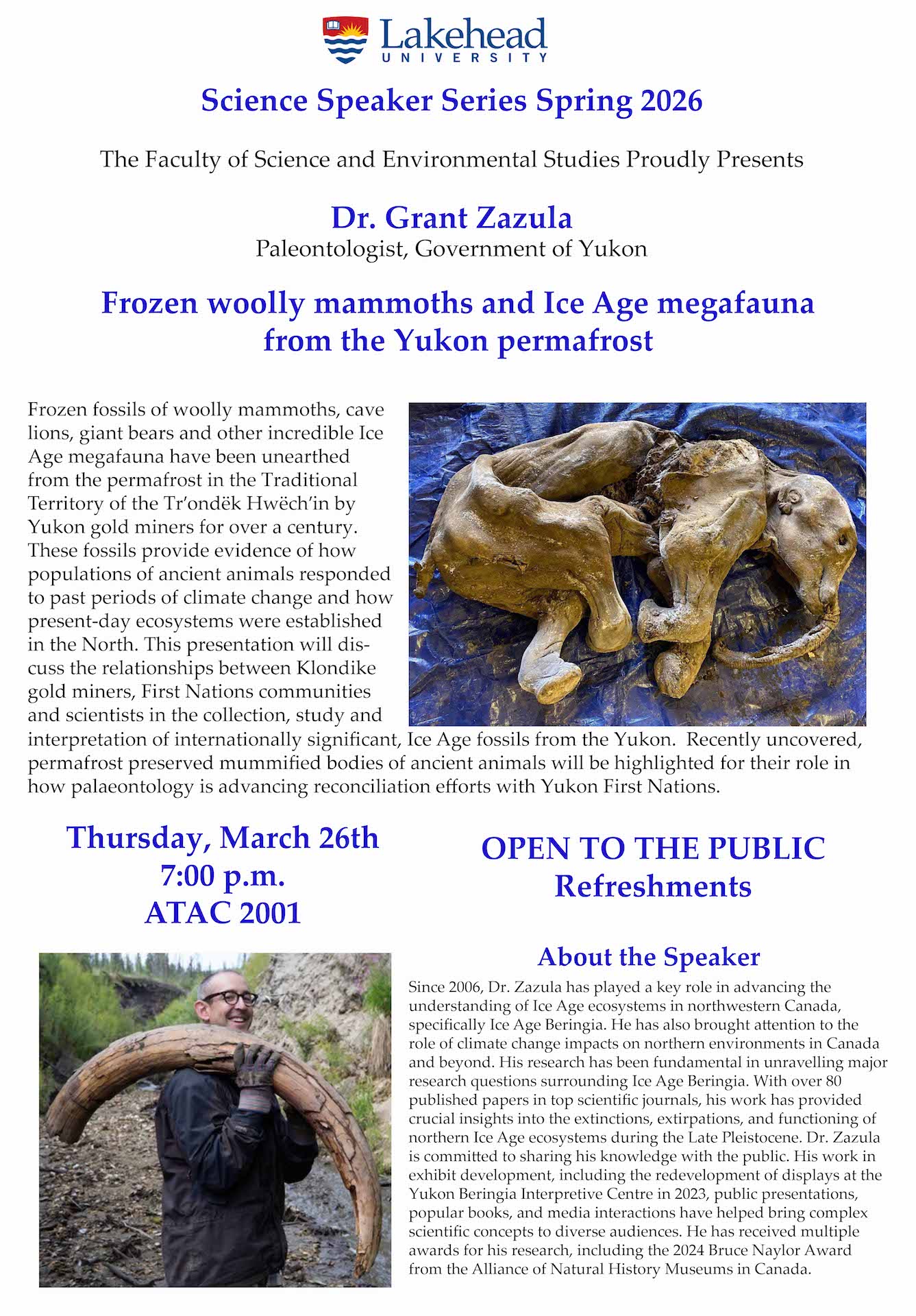 The Faculty of Science and Environmental Studies proudly presents Dr. Grant Zazula, Paleontologist with the Government of Yukon, for the talk, "Frozen woolly mammoths and Ice Age megafauna from the Yukon permafrost".