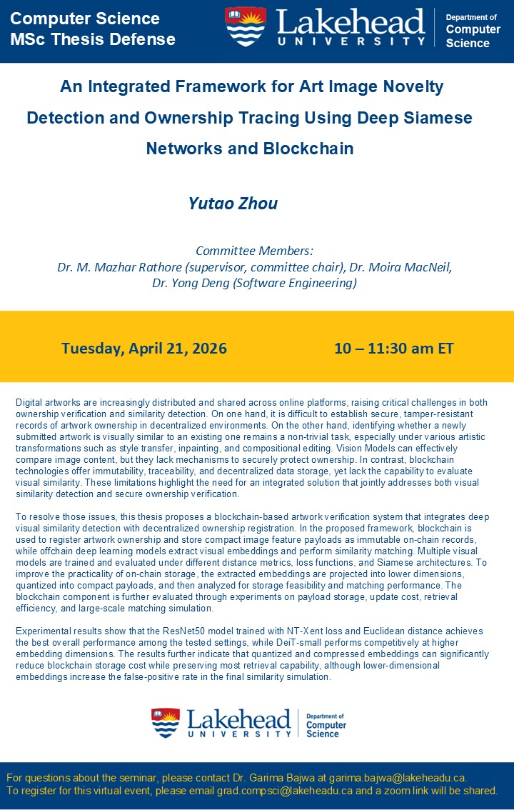 Please contact grad.compsci@lakeheadu.ca for the Zoom link. Everyone is welcome.
