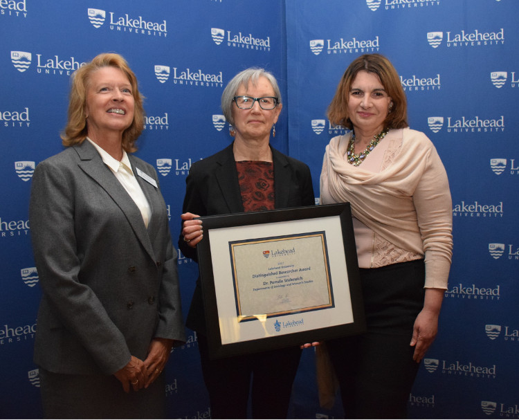 Dr. Pamela Wakewich, centre, was presented with the Distinguished Researcher Award by Dr. Moira McPherson, left, Lakehead’s Interim President and Vice-Chancellor, and Senate Research Committee Chair Dr. Grazia Viola.