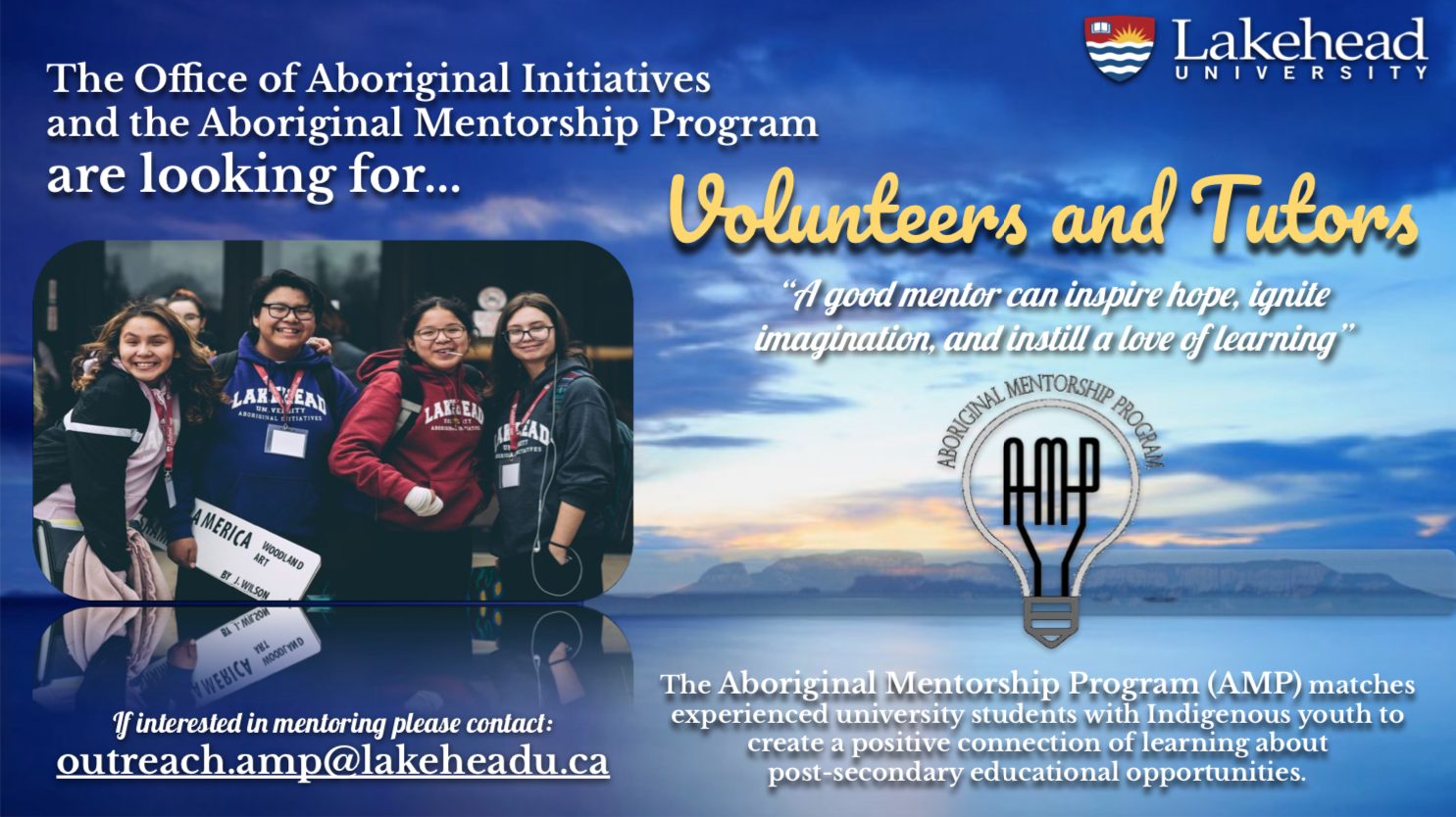 If interested in volunteering your time to mentor or tutor, please contact Outreach Coordinator Chelsey Commisso at outreach.amp@lakeheadu.ca