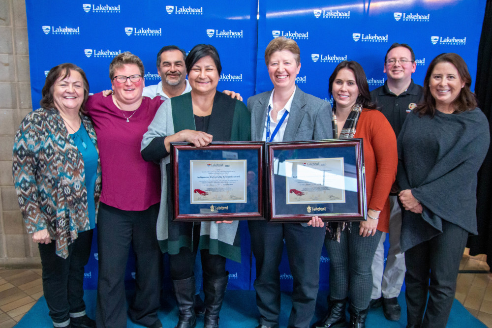 From left, Lillian Calder, Councillor, Bingwi Neyaashi Anishinaabek; Robyn O'Loughlin, Postdoctoral Fellow, EPID@Work Research Institute, Lakehead University; Conway Lesperance, former Health and Safety Advisor, Nokiiwin Tribal Council; Audrey Gilbeau, Executive Director, Nokiiwin Tribal Council; Vicki Kristman, Director, EPID@Work Research Institute & Associate and Professor, Dept. of Health Sciences, Lakehead University; Tiffany Rogowski, Health, Safety and Wellness Advisor, Nokiiwin Tribal Council; Jeff Robert, Health and Safety Advisor, Nokiiwin Tribal Council received the Indigenous Research Partnership Award, presented by Denise Baxter, Vice-Provost, Indigenous Initiatives, Lakehead University, far right, at the 2020 Research Awards of Excellence ceremony hosted by Lakehead University.