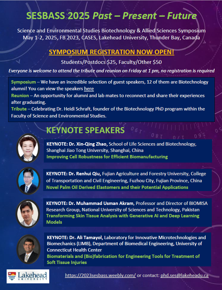 You're invited to the SES Biotechnology and Applied Sciences Symposium (SESBASS 2025) hosted by the Faculty of Science and Environmental Studies at Lakehead University in Thunder Bay, Ontario, Canada, on May 1-2, 2025. This hybrid event will take place in FB 2023 and the Graduate Student Lounge (both in the CASES building) and on Zoom. Updated information about the events can be found here: https://2025sesbass.weebly.com/.