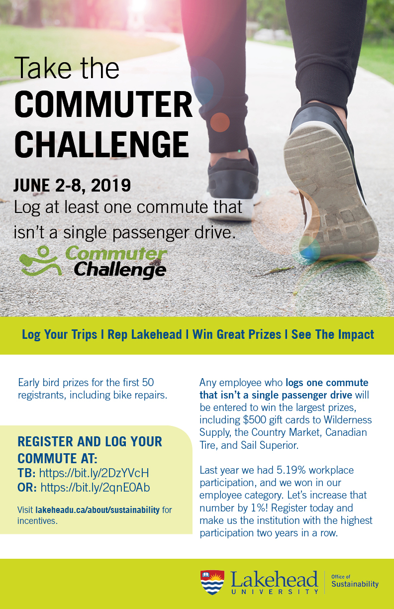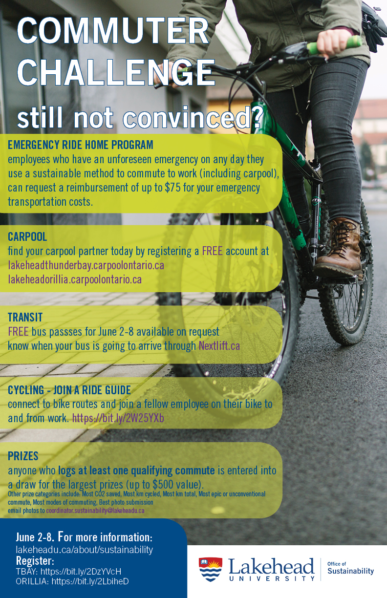 Employees who use the hashtag #lakeheadsustainability or email photos of their commute to coordinator.sustainability@lakeheadu.ca will be entered in a draw for a prize.