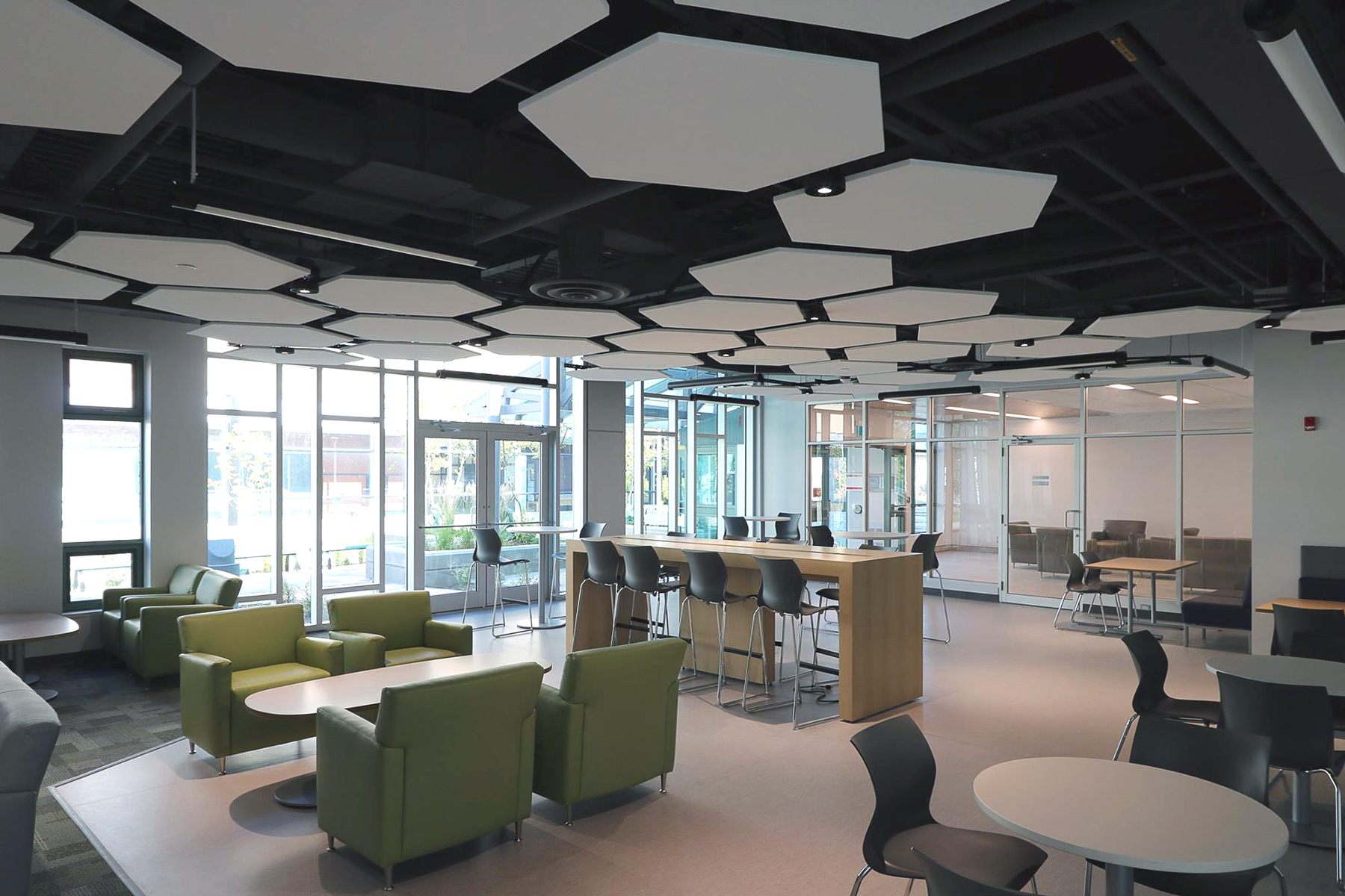Similar to Orillia’s Academic Building, the CASES building is designed with the ability to turn lights off, purposely. Enhanced daytime lighting reduces the need for artificial lighting until necessary. The abundance of natural light also creates a warm atmosphere, promoting health and wellbeing and ample viewing to the outdoors. The window design creates the conditions for passive solar heating which reduces reliance on energy. During the summer season, blinds are in place to help reduce heat gain or discomfort and prevent overheating. The existing atrium was incorporated into the design, bringing natural light onto both the core and sub-ground floor of the building. The building is also equipped with LED and motion sensored lighting.