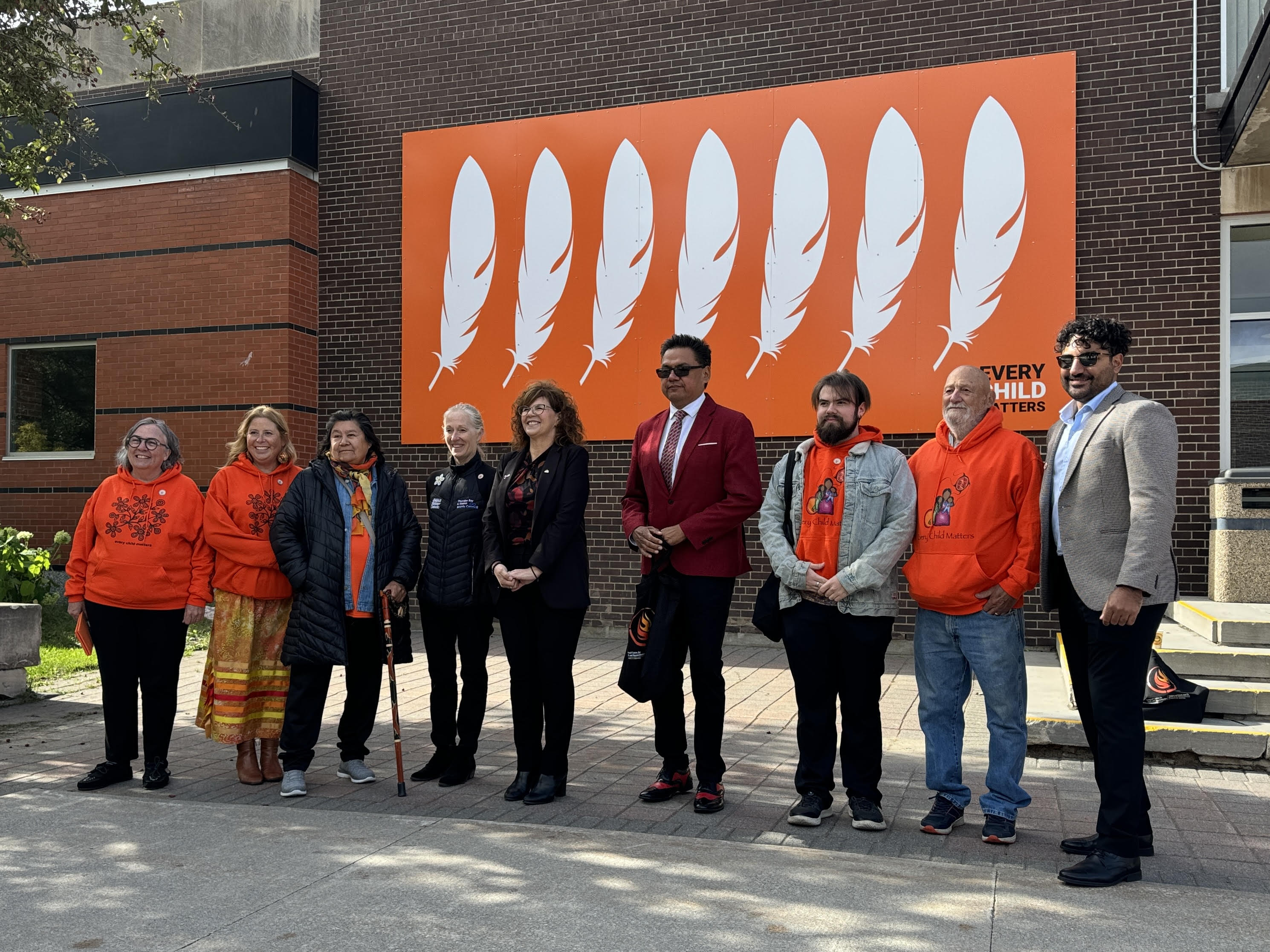 On September 6, an Every Child Matters outdoor art installation was unveiled on the Thunder Bay campus during a ceremony to honour the children lost to the residential school system, residential school survivors, and their families. "Art has the power to create a safe space where the truths of our past can be seen, heard, and felt," explained Indigenous Initiatives Vice-Provost Denise Baxter. The art installation features seven white eagle feathers on an orange background to embody the Seven Sacred Teachings of Wisdom—Love, Respect, Bravery, Honesty, Humility, and Truth—spiritual principles central to many Indigenous cultures across North America. Together, these teachings offer guidance on how to live and act in harmony with one another, and they allow communities to thrive. As part of the ceremony, the National Centre for Truth and Reconciliation Survivors' Flag was raised. This event marked the start of learning opportunities held on both Lakehead campuses throughout the month, leading up to the National Day for Truth and Reconciliation on September 30.