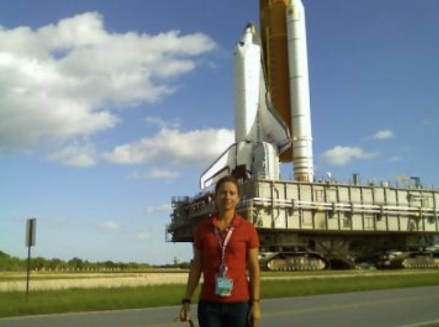 Pictured right: Colette near Shuttle Atlantis during roll out to launch pad