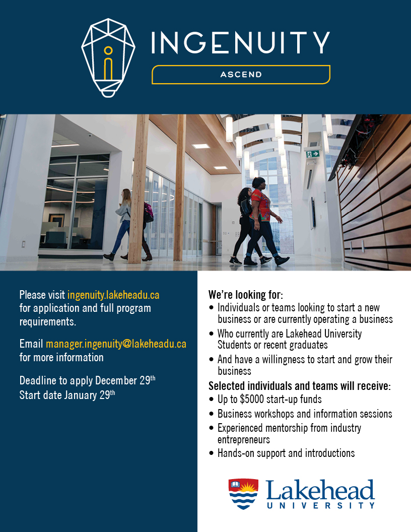 About the Ingenuity Accelerator program: Ingenuity Ascend Accelerator program is a great opportunity for entrepreneurial minded Lakehead University students and alumni looking to transition an idea into a business opportunity or accelerate the growth and development of their early stage start-up. The Ingenuity Accelerator program will accepts up to 4 business ideas per cohort and deliver up to $5000 per business idea for costs associated with business development.