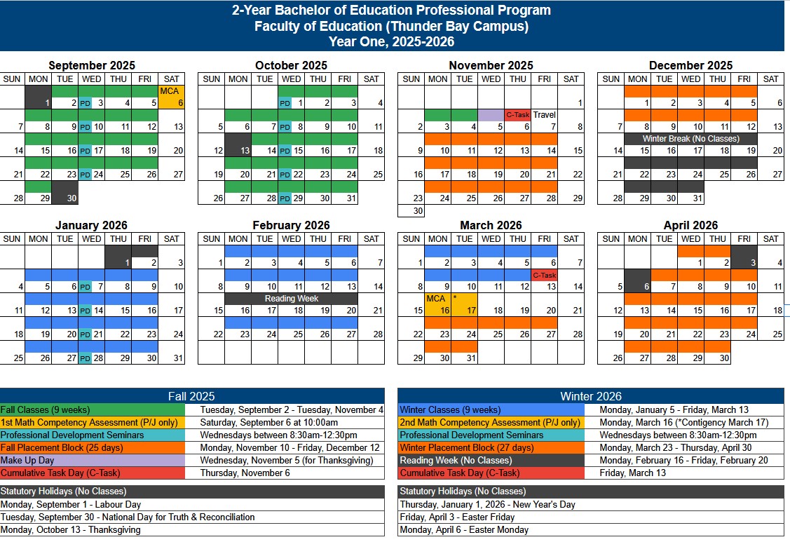 The following schedules outline practicum dates for the Bachelor of Education degree (BEd) Two-Year Professional Program, 2025-2026 academic year (Thunder Bay campus).