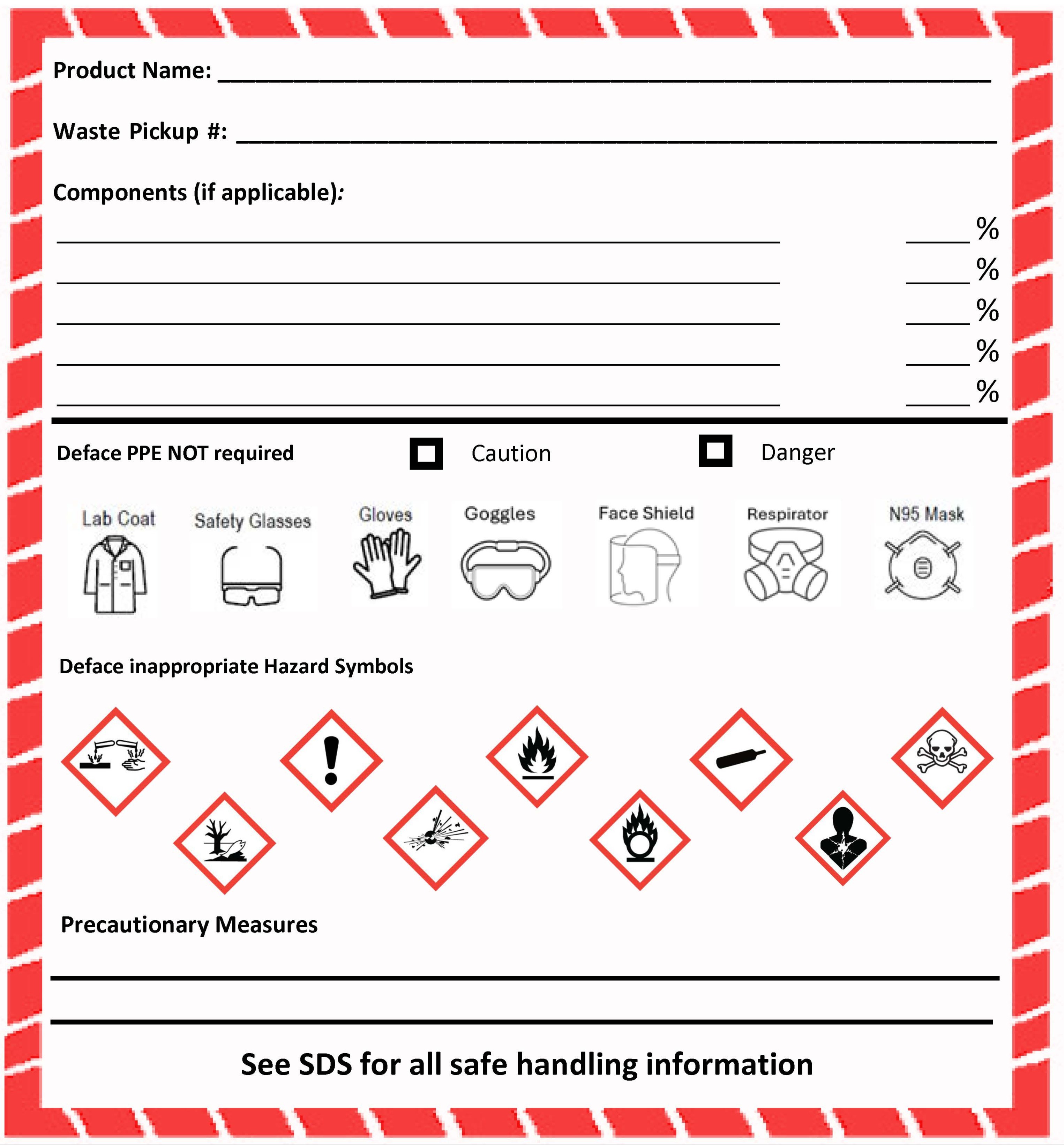 Below are some WHMIS Compliant Hazardous Waste Labels. Some common Avery label sheets (labelled by product number) of blank hazardous waste labels and a blank individual label, that can be downloaded and sized as needed, are included.
