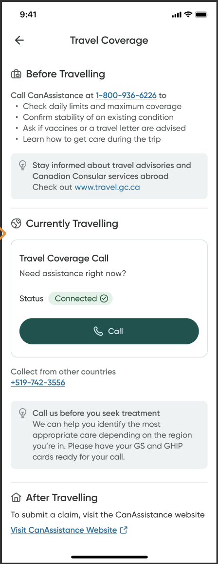 GreenShield has announced a new enhancement in GS+ web and mobile platforms that makes accessing travel support easier than ever. This new feature streamlines travel information within the ‘Coverage’ section, where you can quickly access: