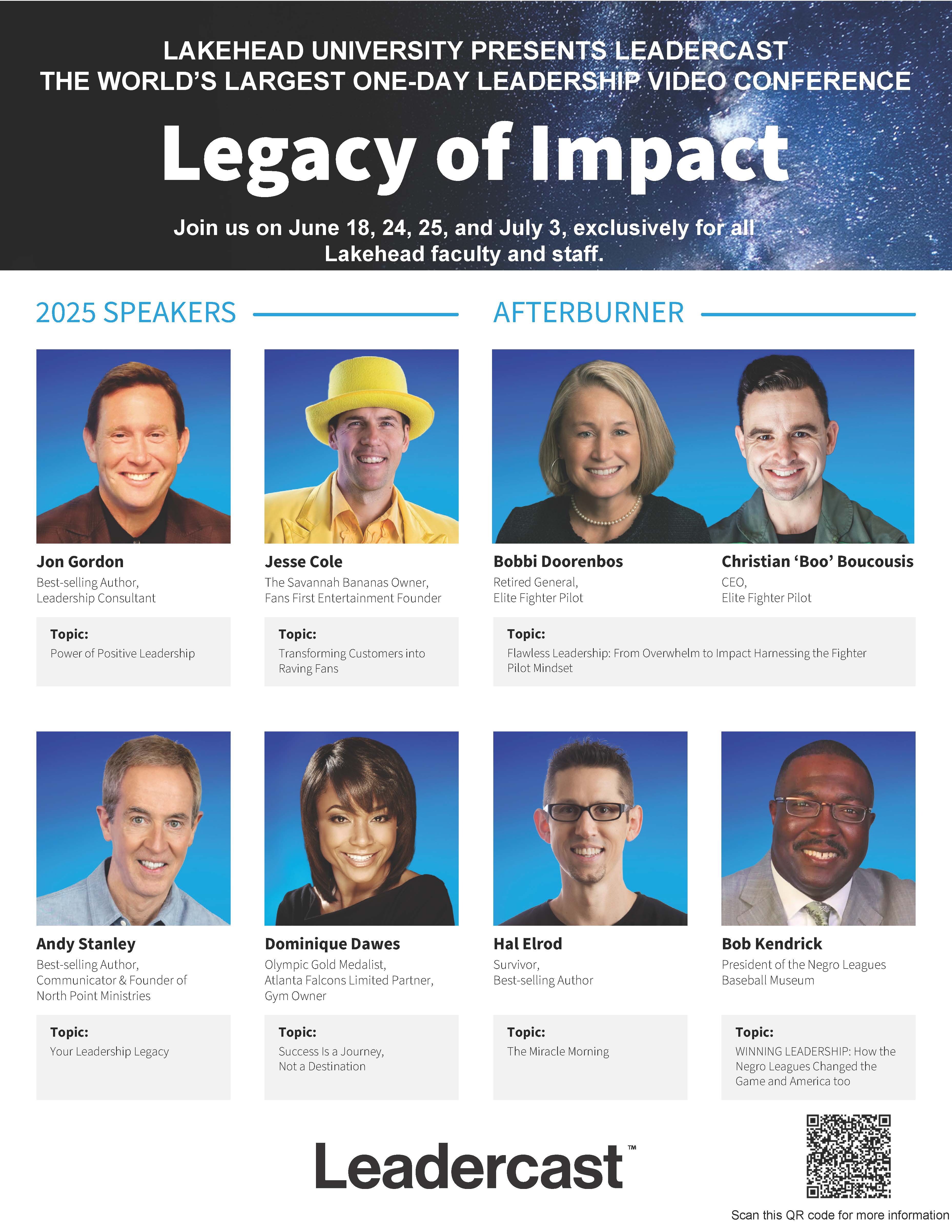 As part of our ongoing commitment to invest in our people, Human Resources is thrilled to offer complimentary access to Leadercast 2025 – Leadercast is the world’s largest one-day leadership conference. This event is being brought to our campuses between June 18th and July 10th as part of Lakehead’s strategic focus on cultivating leadership at all levels.