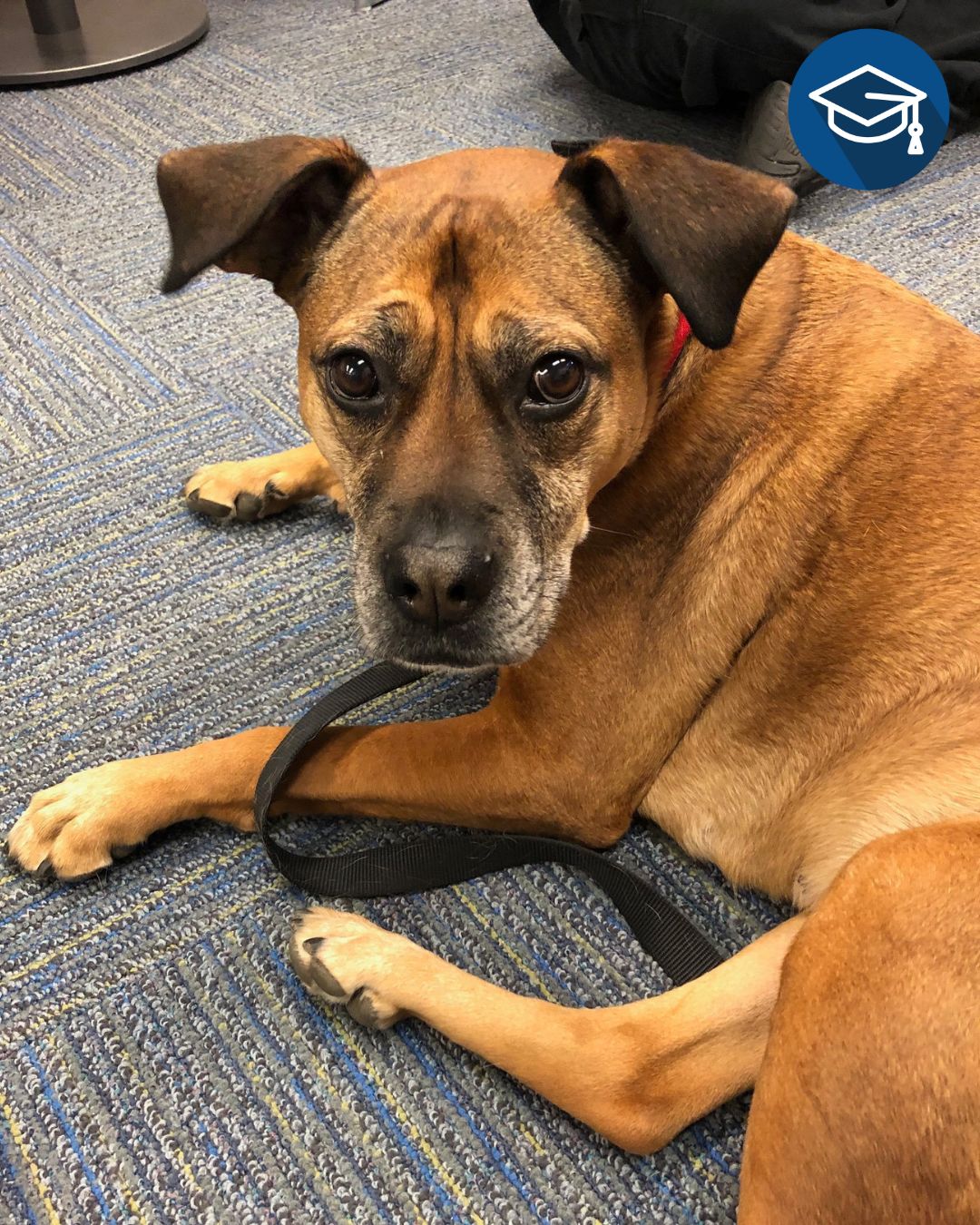 Image Description: A brown dog in the Student Accessibility Services Access Lounge looking at the camera. Academic Support icon in the top right corner.