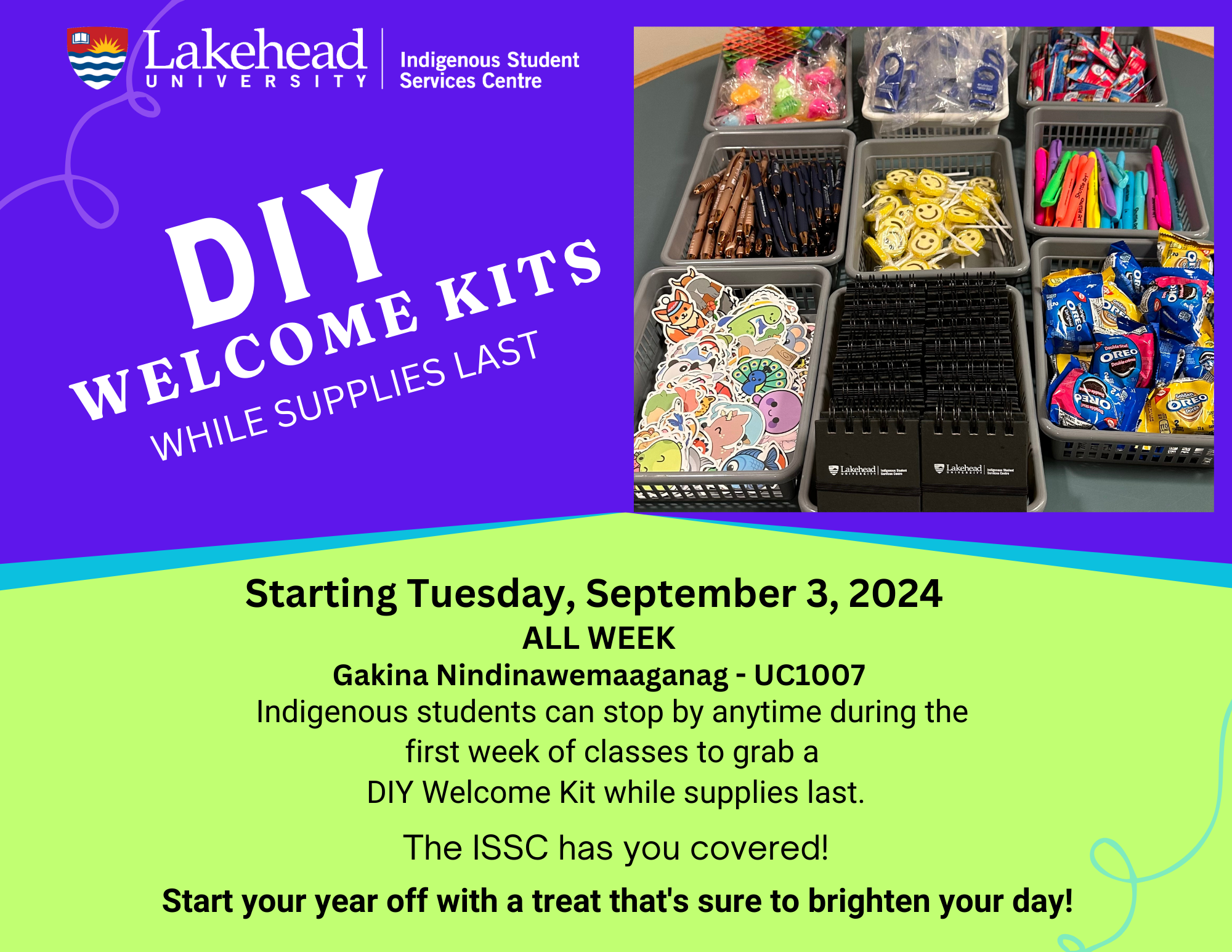 Indigenous students can stop by anytime during the first week of classes to grab a DIY Welcome Kit while supplies last.