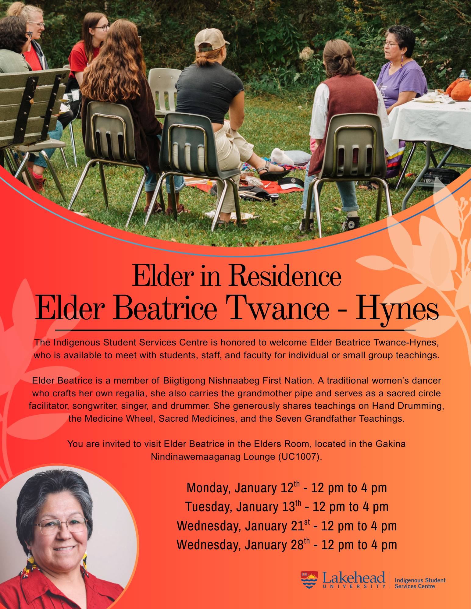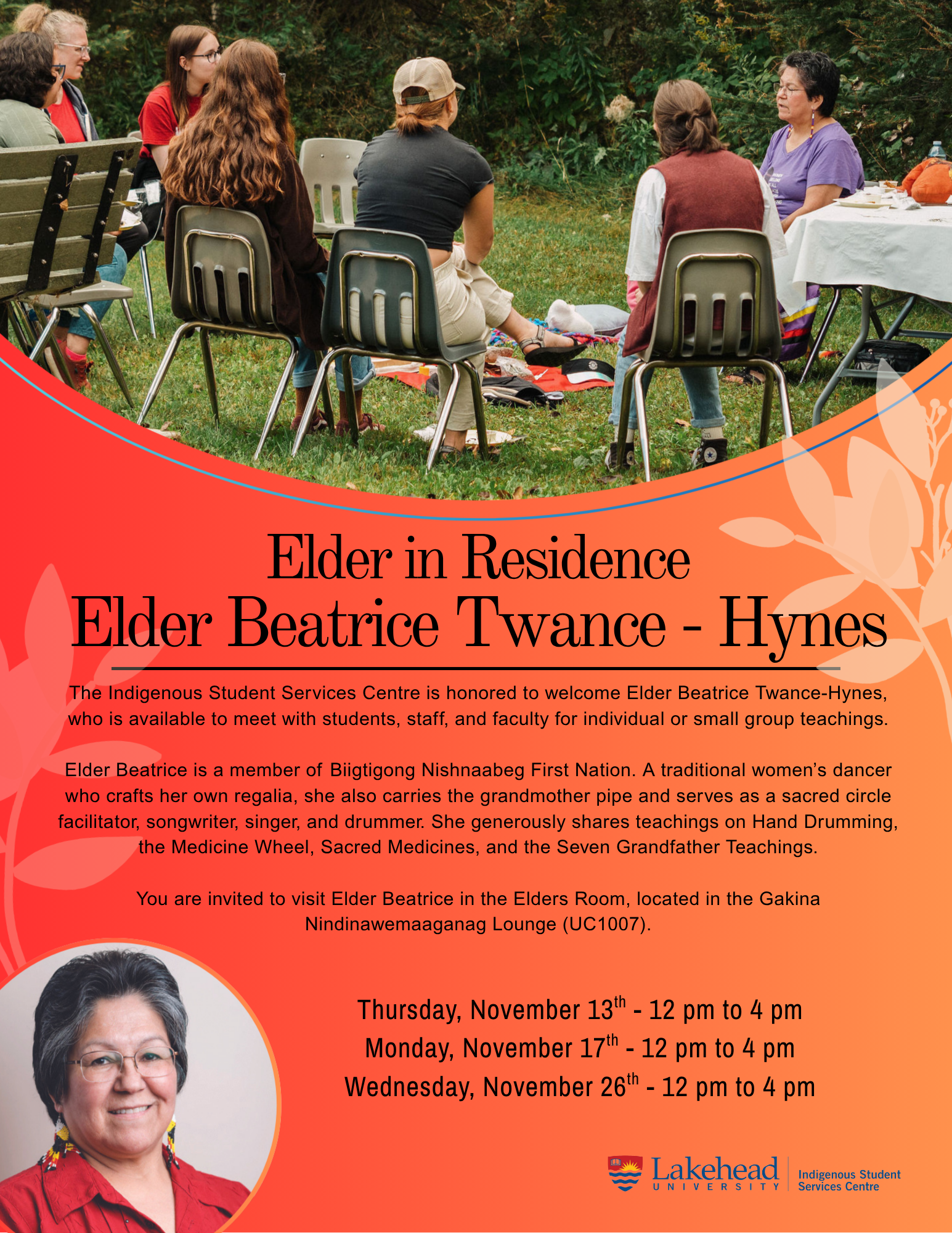 You are invited to visit Elder Beatrice in the Elders Room, located in the Gakina Nindinawemaaganag Lounge (UC1007).