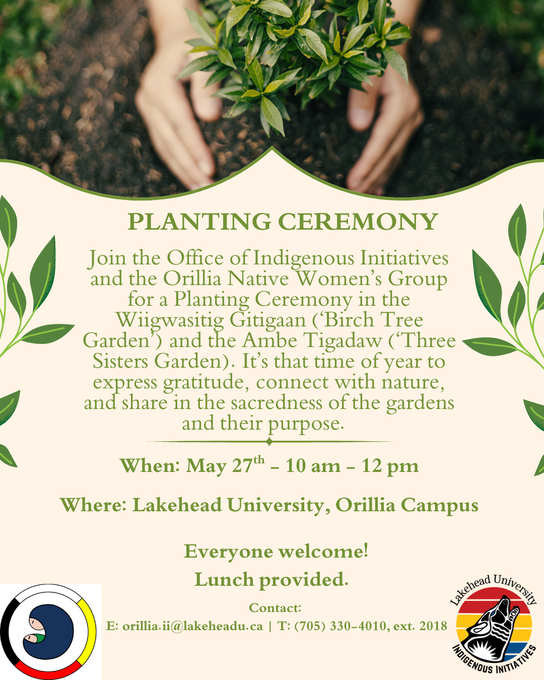 Join the Office of Indigenous Initiatives and the Orillia Native Women's Group for a Planting Ceremony in the Wiigwasitig Gitigaan 'Birch Tree Garden' and the Ambe Tigadaw 'Three Sisters Garden.' It's that time of year to express gratitude, connect with nature, and share in the sacredness of the gardens and their purpose.