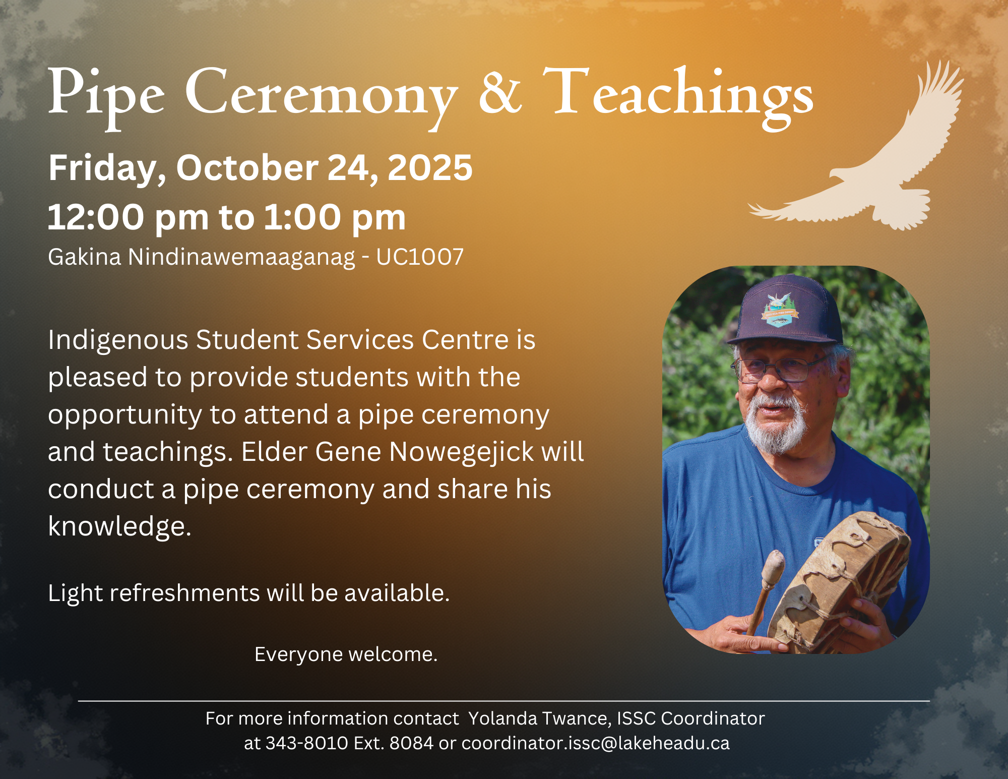 Indigenous Student Services Centre is pleased to provide students with the opportunity to attend a pipe ceremony and teachings. Elder Gene Nowegejick will conduct a pipe ceremony and share his knowledge.