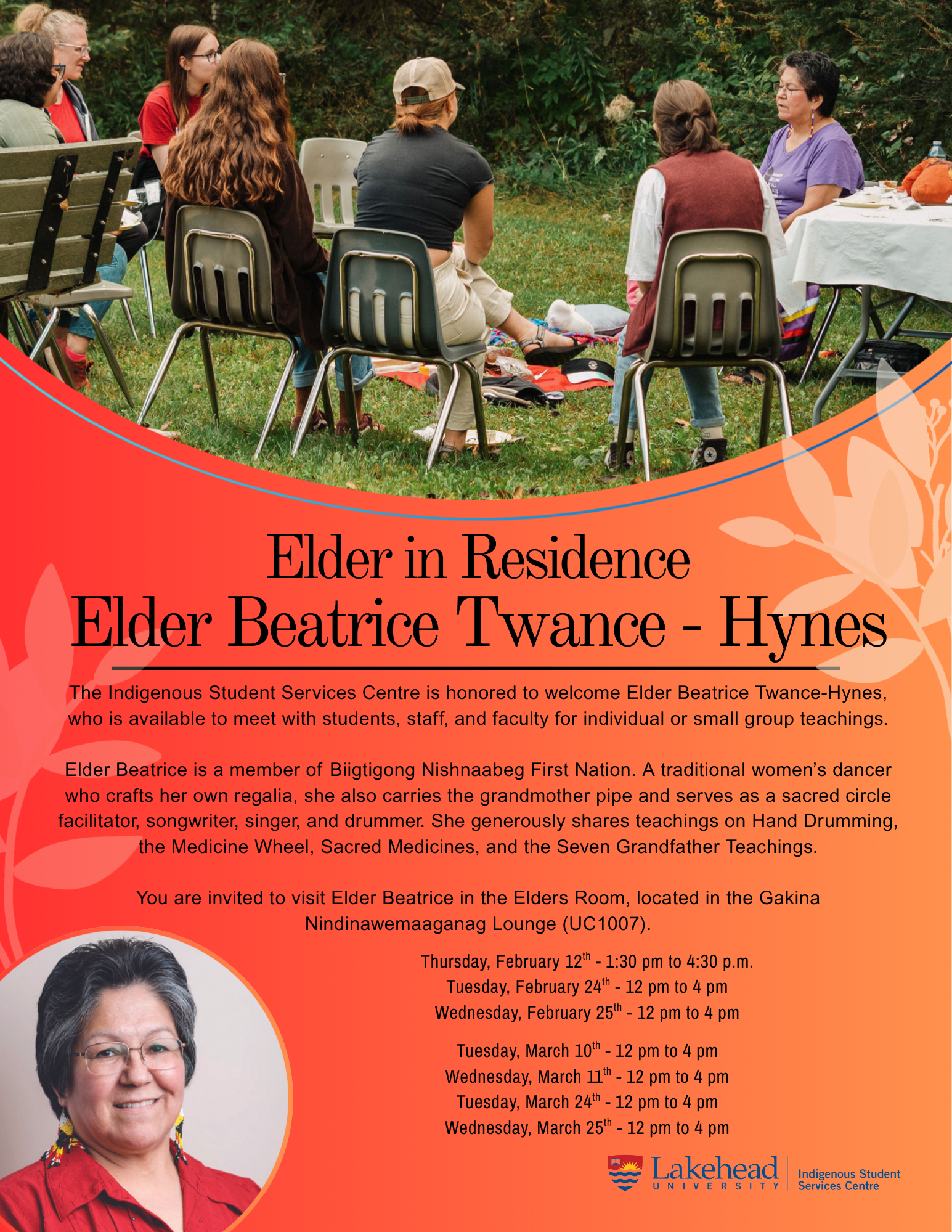 The Indigenous Student Services Centre is honoured to welcome Elder Beatrice Twance-Hynes, who is available to meet with students, staff, and faculty for individual or small group teachings.