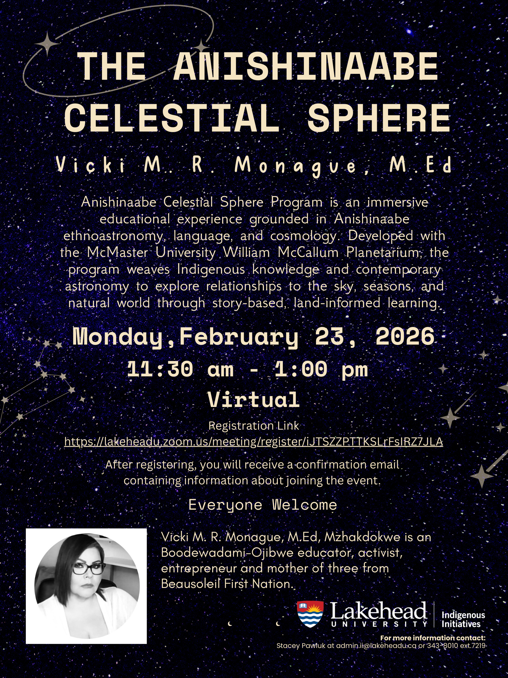 The Anishinaabe Celestial Sphere program, developed in partnership with McMaster University William McCallum Planetarium, is an educational program that is grounded in Anishinaabe ethnoastronomy, language and cosmology. The program brings together Indigenous knowledge systems and contemporary astronomical science to support place-based, land-informed learning that reflects Anishinaabe relationships to the sky and constellations, the seasons, and the natural world. Through immersive, story-based and experiential pedagogical approaches, participants engage with Anishinaabe star knowledge as a living system of teachings that conveys moral responsibility, ecological stewardship, and collective memory.