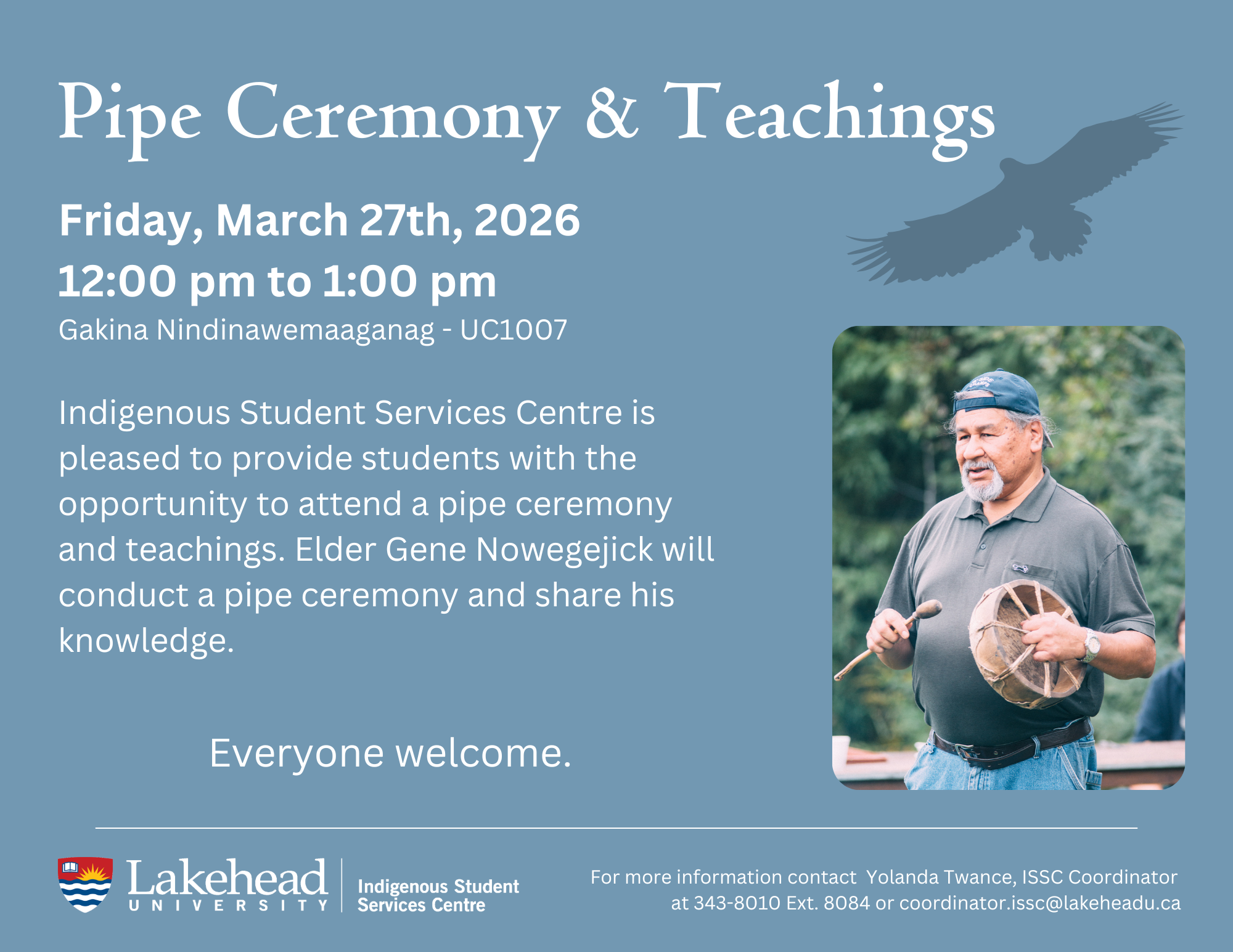 Indigenous Student Services Centre is pleased to provide students with the opportunity to attend a pipe ceremony and teachings. Elder Gene Nowegejick will conduct a pipe ceremony and share his knowledge.