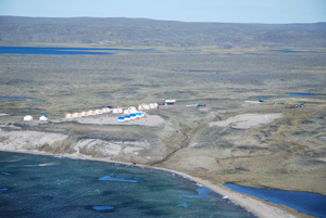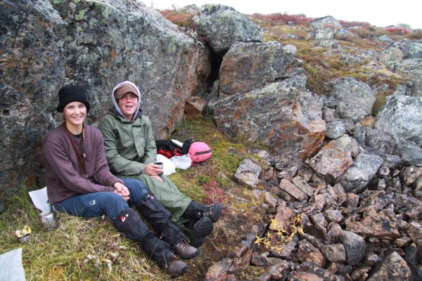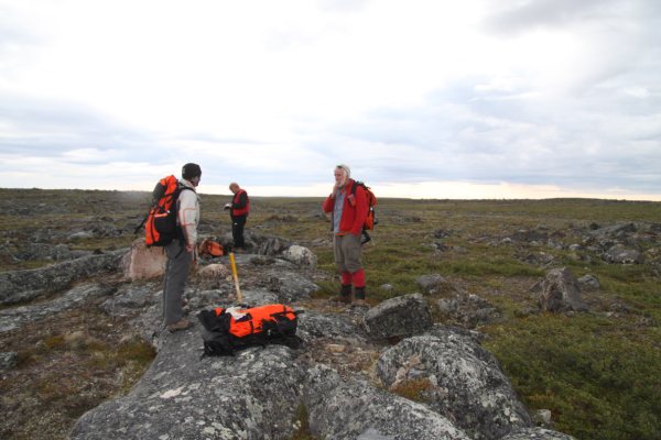 Ruth and Katarina Bjorkman spent part of their summer mapping on the Hackett River Project for Sabina Silver. In Katarina's words "It is an advanced VMS project centred on Camp Lake, located ~300km NNW of Yellowknife and ~70km S of Bathurst Inlet (Arctic Ocean.). There were between 30-40 people in camp at a time with a field crew, a team for core-land, drillers, geophysicist, camp management, cooks and the helicopter crew. We were transported each day by helicopter to our area of mapping where we mapped lithology as well as alteration, which occurred as distinct coarse-grained amphibolite-grade mineral assemblages. The barrenlands are beautiful, with boulder-strewn ridges, eskers and morraines inhabited by stunted shrubs, caribou, hare, sic-sics, occasional Grizzly bears and muskox, and dotted with trout-laden blue-green lakes and streams." |