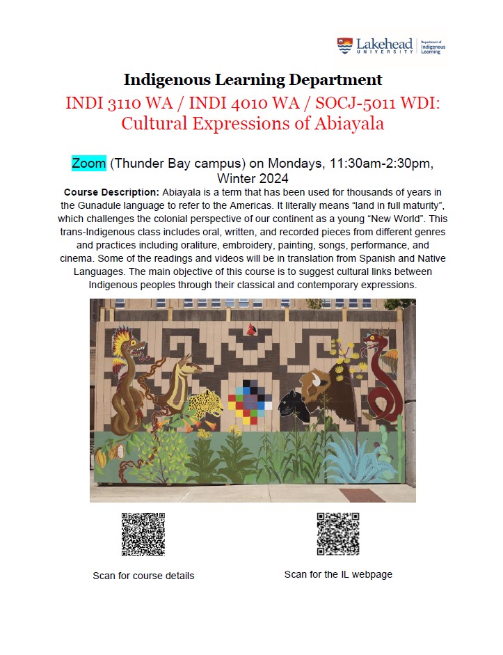 INDI 3110 WA / INDI 4010 WA / SOCJ 5011 WDI: "Cultural Expressions of Abiayala" on Zoom (Thunder Bay campus) on Mondays, 11:30am-2:30pm, Winter 2024