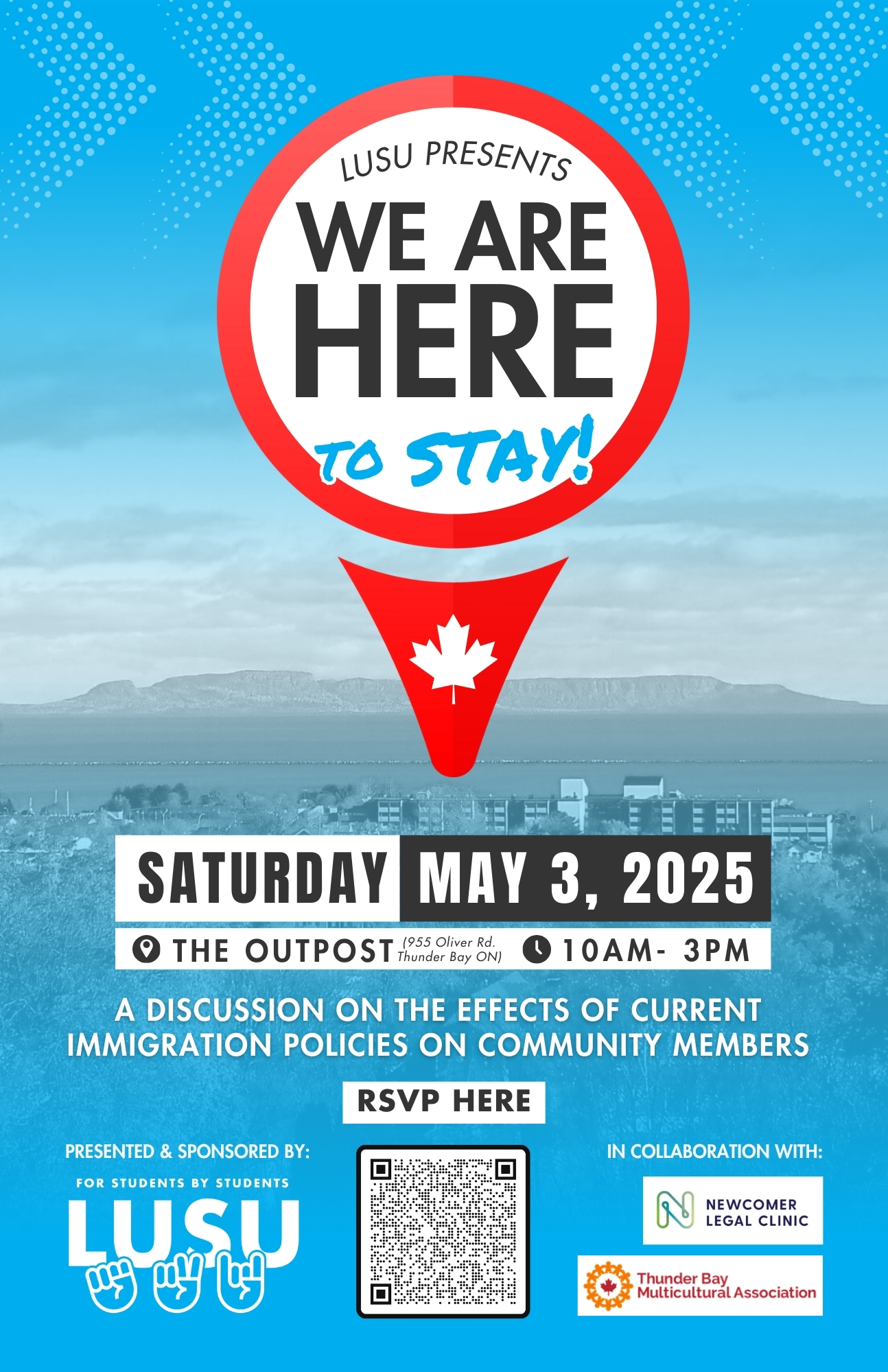 This conference, called We Are Here To Stay, will be held at the Outpost on Lakehead Main Campus on Saturday, May 3, 2025 from 10:00 a.m. - 3:00 p.m. EST. Please use the QR Code in the invitation to RSVP for the event.