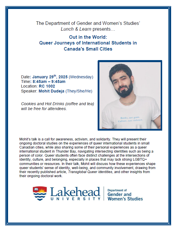 Mohit’s talk is a call for awareness, activism, and solidarity. They will present their ongoing doctoral studies on the experiences of queer international students in small Canadian cities, while also sharing some of their personal experiences as a queer international student in Thunder Bay, navigating intersecting identities such as being a person of color. Queer students often face distinct challenges at the intersections of identity, culture, and belonging, especially in places that may lack strong LGBTQ+ communities or resources. In their talk, Mohit will discuss how these experiences shape queer students’ sense of identity, well-being, and community involvement, drawing from their recently published article, Transglobal Queer Identities, and other insights from their ongoing doctoral work.