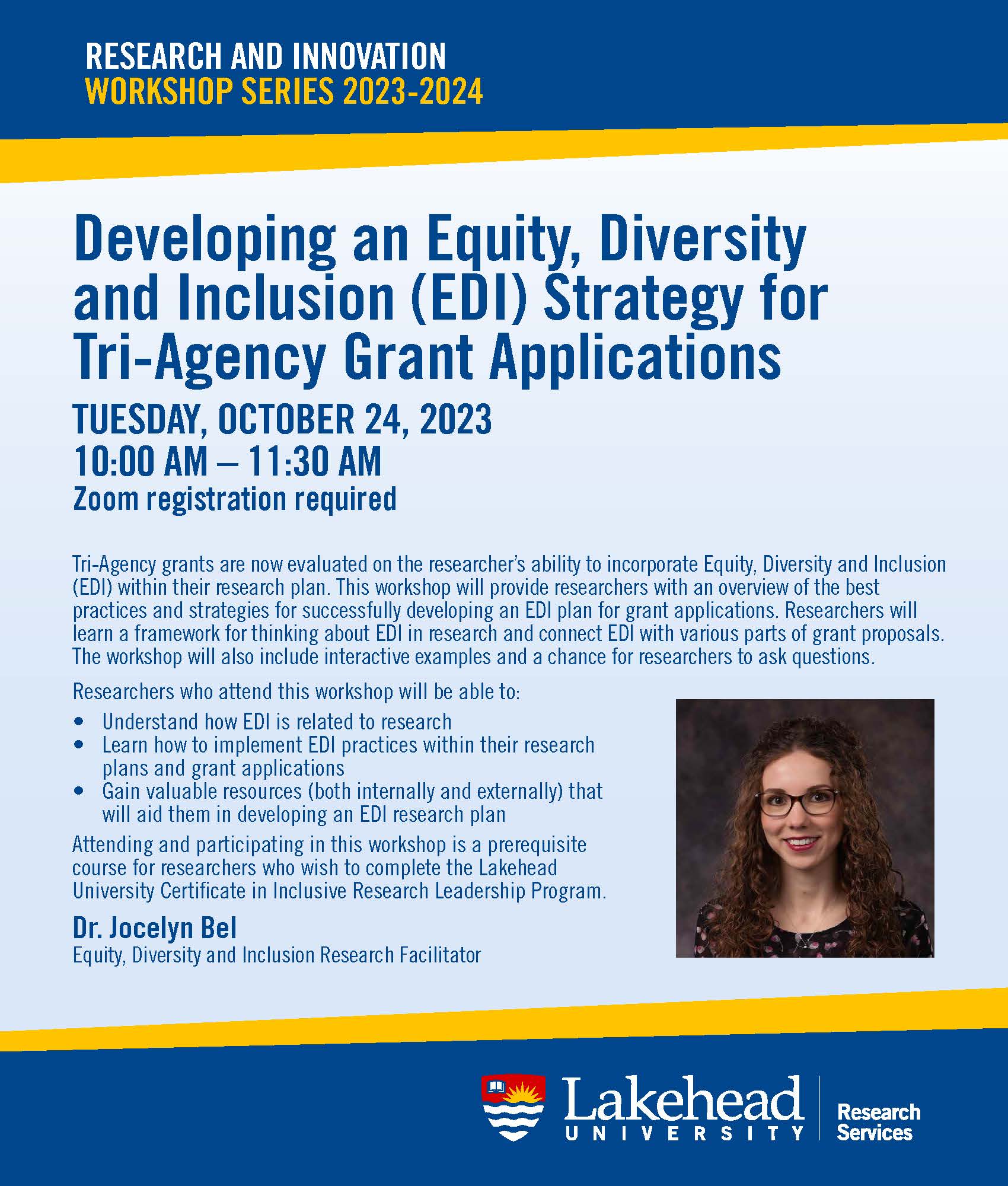 Tri-Agency grants are now evaluated on the researcher’s ability to incorporate Equity, Diversity and Inclusion (EDI) within their research plan. This workshop will provide researchers with an overview of the best practices and strategies for successfully developing an EDI plan for grant applications. Researchers will learn a framework for thinking about EDI in research and connect EDI with various parts of grant proposals. The workshop will also include interactive examples and a chance for researchers to ask questions.