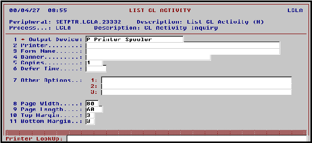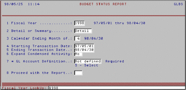 The GLBS is a report of transactions for any selected period of time in the fiscal year in detail or summary format. The detail format enables the user to print a report of every transaction during a specified period of time, this being the main purpose of this report. (The summary format gives the balances of the GL account by selecting which month the ending balances would like to be reported). These reports can be printed out or can be viewed on screen.