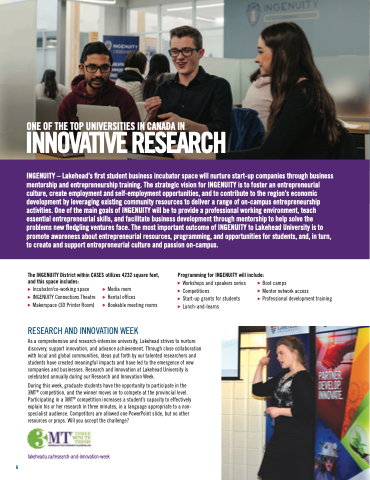 INGENUITY – Lakehead’s first student business incubator space will nurture start-up companies through business mentorship and entrepreneurship training. The strategic vision for INGENUITY is to foster an entrepreneurial culture, create employment and self-employment opportunities, and to contribute to the region’s economic development by leveraging existing community resources to deliver a range of on-campus entrepreneurship activities. One of the main goals of INGENUITY will be to provide a professional working environment, teach essential entrepreneurial skills, and facilitate business development through mentorship to help solve the problems new fledgling ventures face. The most important outcome of INGENUITY to Lakehead University is to promote awareness about entrepreneurial resources, programming, and opportunities for students, and, in turn, to create and support entrepreneurial culture and passion on-campus.