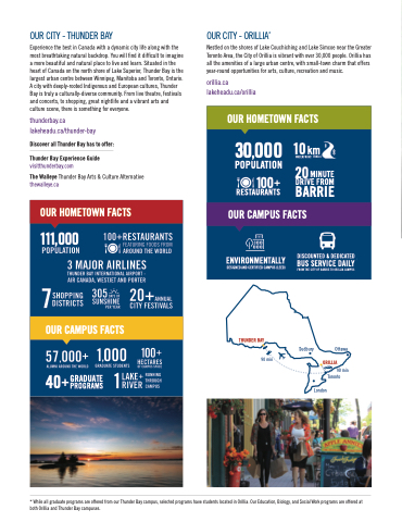 * While all graduate programs are offered from our Thunder Bay campus, selected programs have students located in Orillia. Our Education, Biology, and Social Work programs are offered at both Orillia and Thunder Bay campuses.