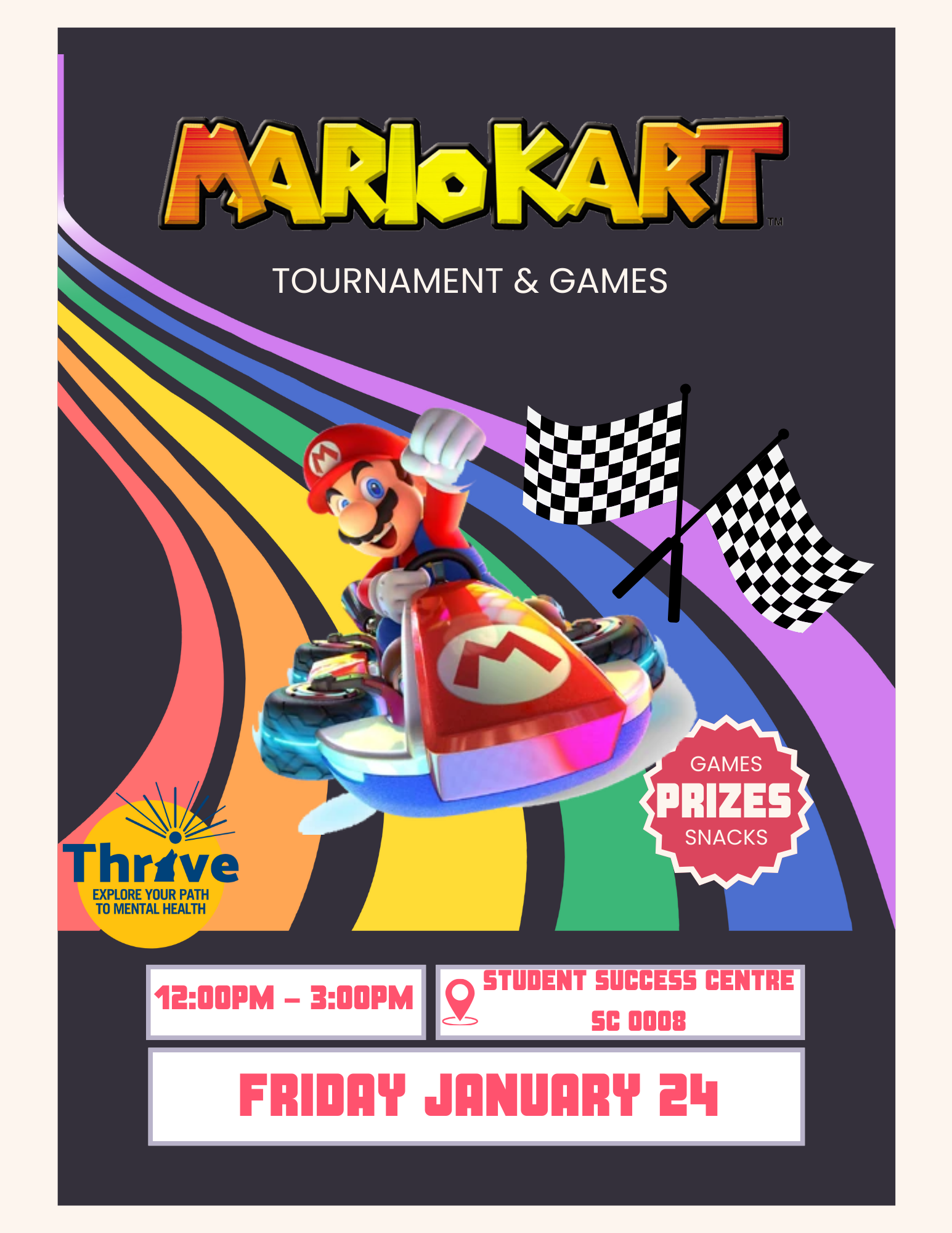Rev up your engines and join the Student Success Centre for an exciting Mario Kart Tournament during Thrive Week! Put your racing skills to the test, compete for bragging rights, and connect with fellow students in a fun and friendly atmosphere. No experience? No problem—this event is all about having a great time!