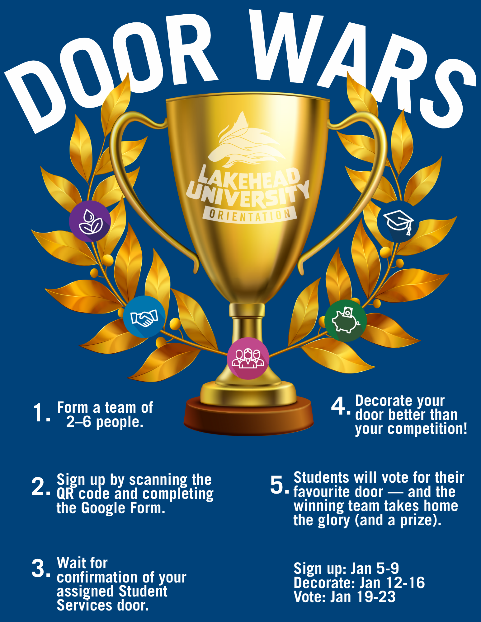 Assemble a team of 2–6 students and you’ll be assigned a Student Affairs office door to decorate by a set deadline. After the decorating period ends, all students will have the chance to vote for their favourite door, and the team with the most votes will win a prize!