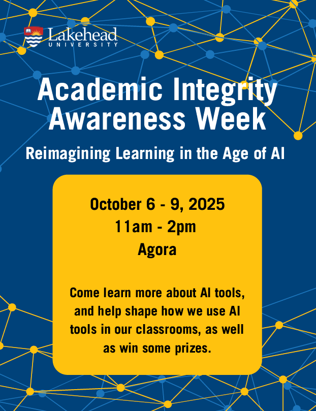 This year’s Academic Integrity Awareness Week will be held alongside Teaching and Learning Week for a collaborative, four-day exploration of Teaching, Assessment, and AI. Join us for a week of professional development, conversation, and practical insights on how AI is transforming teaching and learning. Sessions will feature faculty-led showcases, hands-on tool explorations, and facilitated discussions to help shape Lakehead’s future approach to AI, assessment, and academic integrity.