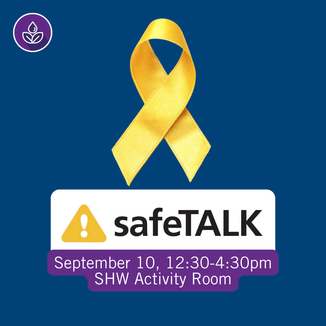 safeTALK is a 4-hour, in-person workshop to build skills in suicide prevention. Participants will learn how to recognize and engage with someone thinking about suicide, overcome attitudes that act as barriers to help, talk openly about suicide and connect with intervention resources for further support.